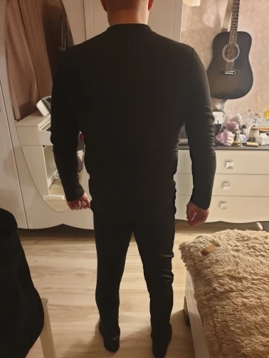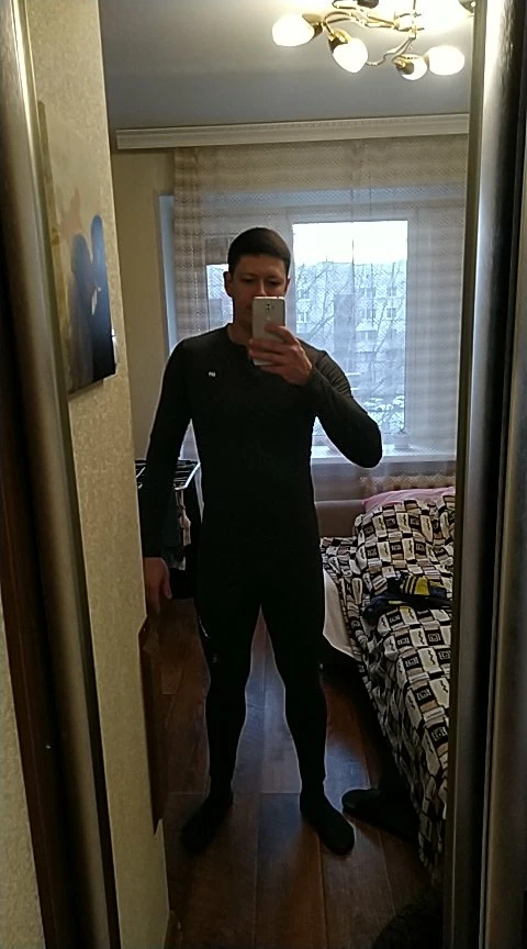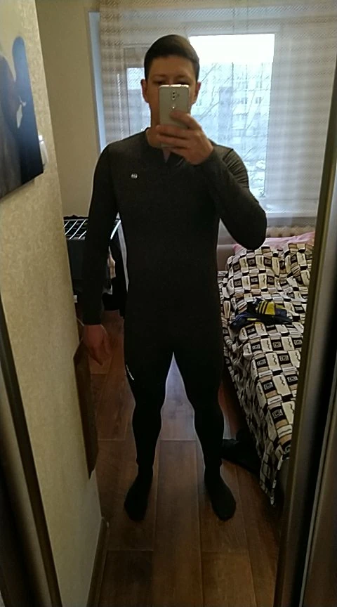 Комплект очень приятный к телу. По размеру подошёл (52-54 размер рус.). По росту чуть великоват (168 см.)-не критично. Присутствует "животик"-в облипочку натянулся. Всё отлично. Ворот треугольником для морозов не очень, муж попросил прострочить. А так очень понравился комплект, швы качественные.