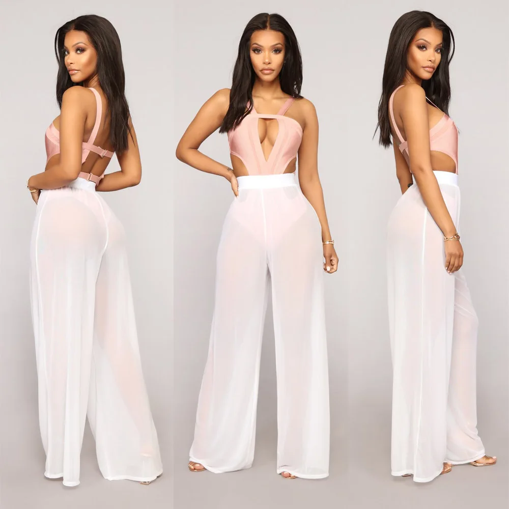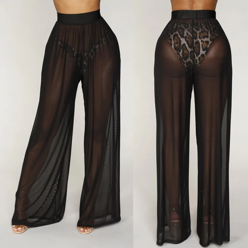 Сексуальные женские брюки в стиле бохо с широкими штанинами, с высокой талией, прозрачные, пляжные, длинные, свободные, из прозрачной сетки, экзотические брюки, размера плюс