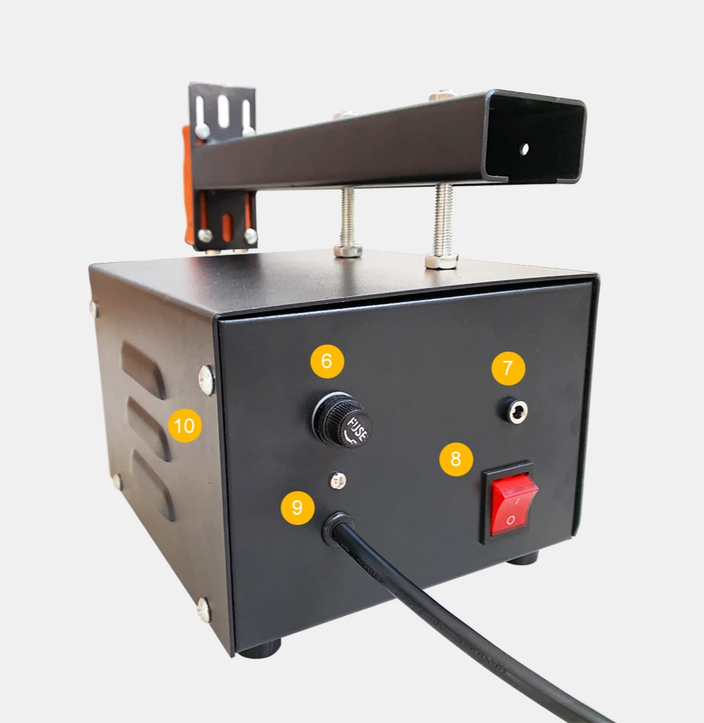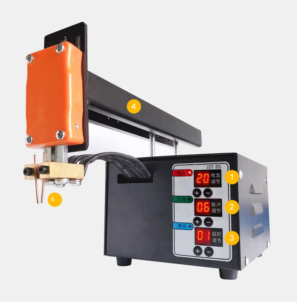 1. Сварочный ток (01-99 регулируемый) 2. Импульсный дисплей (01-06 регулируемый) 3. Регулировка задержки (01-99 регулируемый) 4. Фиксирующий кронштейн 5. Сварочная головка