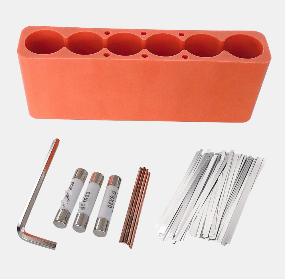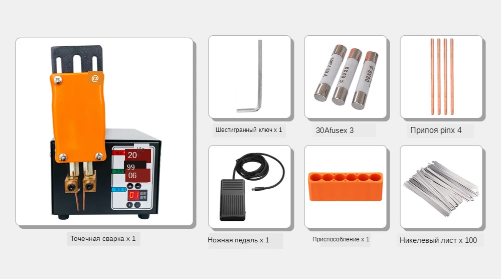 Точечная сварка x 1 ножная педаль x 1 крепеж x 1 никелевый лист x 100 шестигранный ключ x 1 30A предохранитель x 3 паяльный штифт x 4