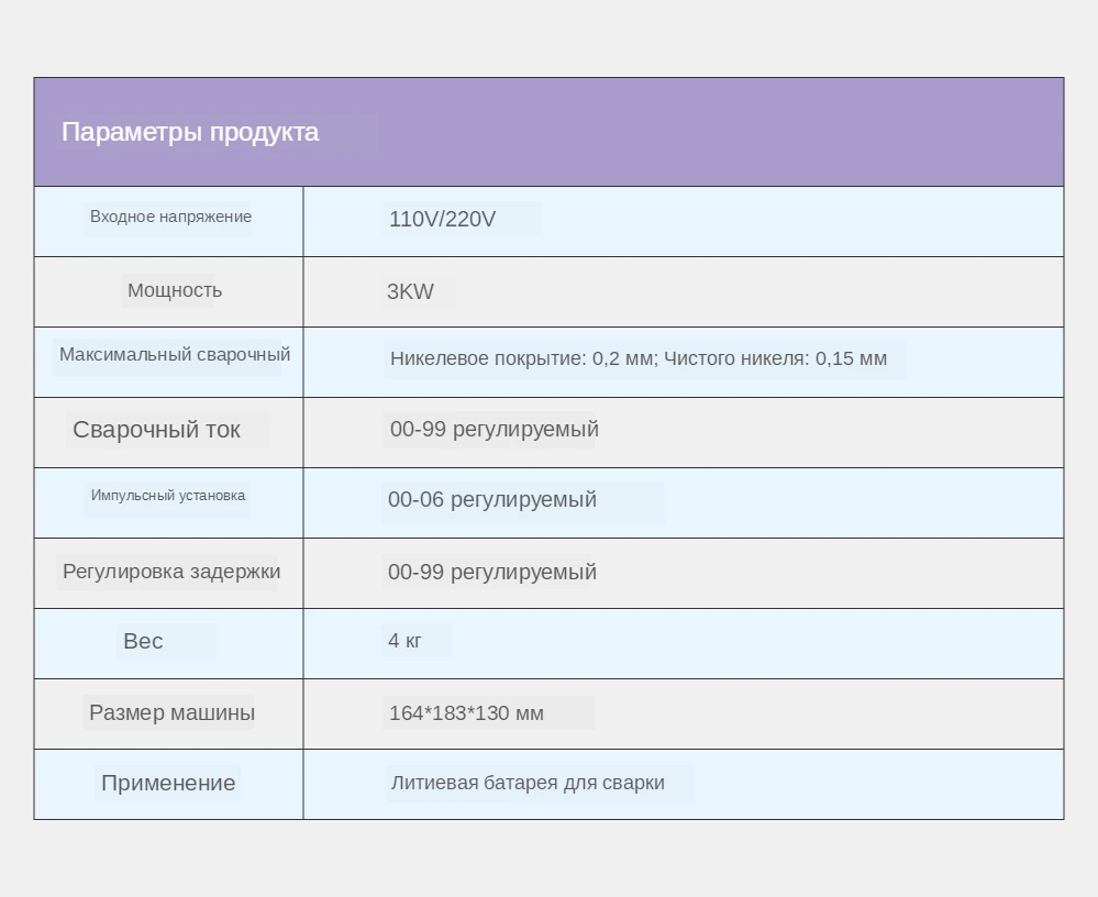 Вход напряжение: 110V/220V Мощность: 3KW максимальный сварочный: покрытие никелем 0,2 мм; Чистый Никель 0,15 мм сварочный ток: 00-99 Регулируемый Импульсный окружающая Обстановка: 00-06 Регулируемая задержка регулировки: 00-99 Регулируемый Вес: 4 кг Размер машины: 164*183*130 мм ПРИМЕНЕНИЕ: сварка литиевой батареи