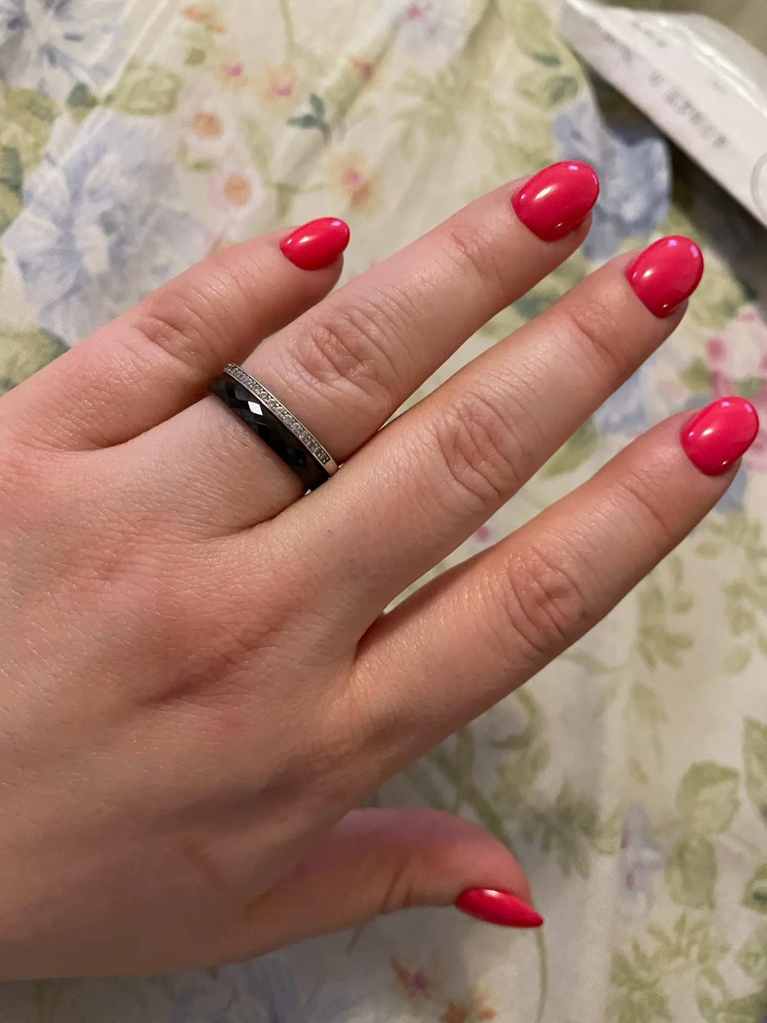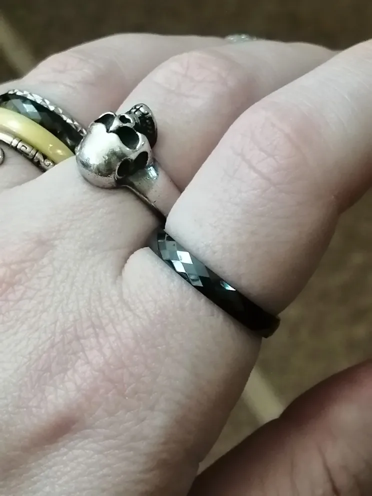 Очень долгая доставка, выдали на почте. Отслеживание не точное. Но кольцо вполне милое, прикольно переливается и смотрится интереснее широкого с большими гранями.
