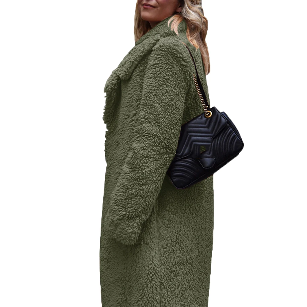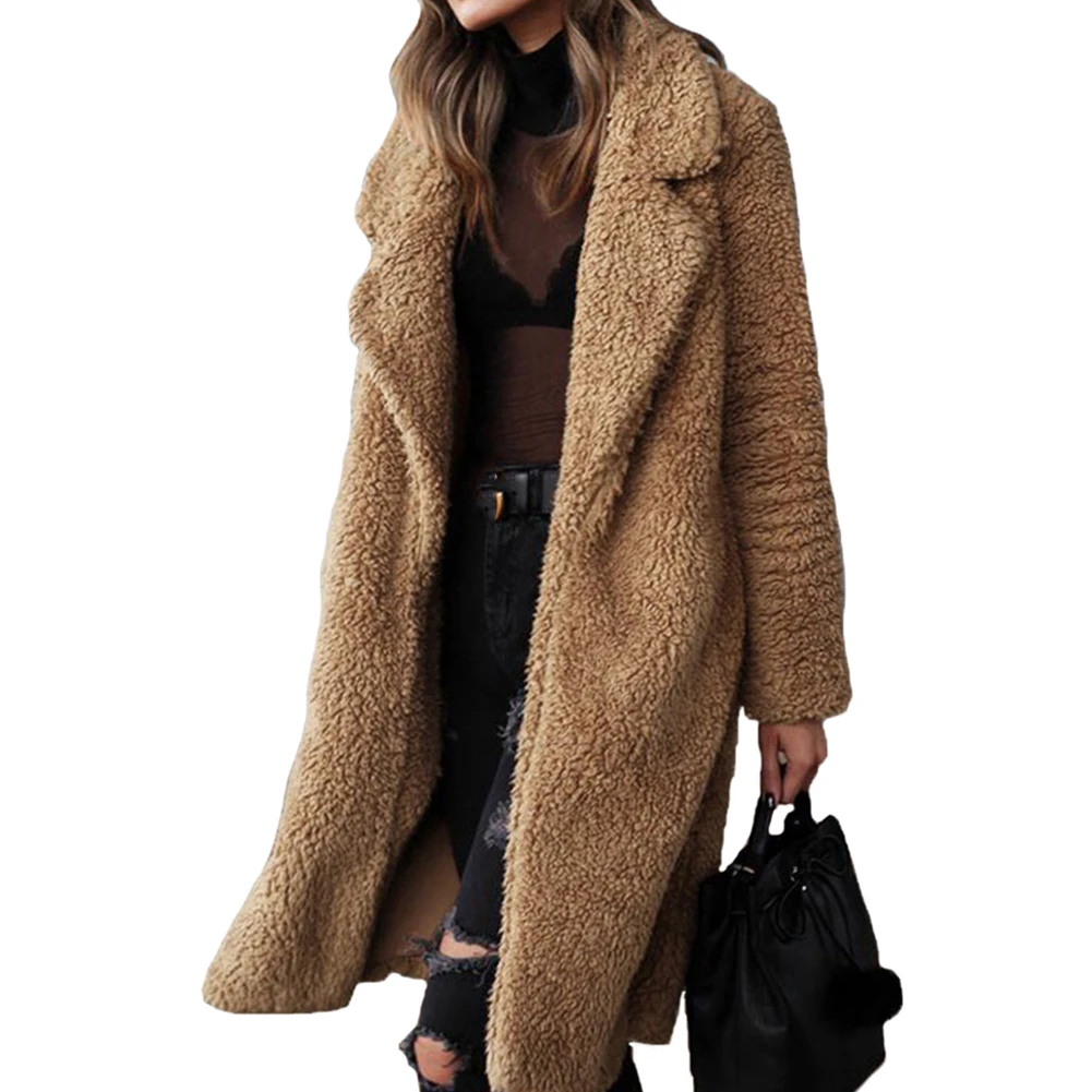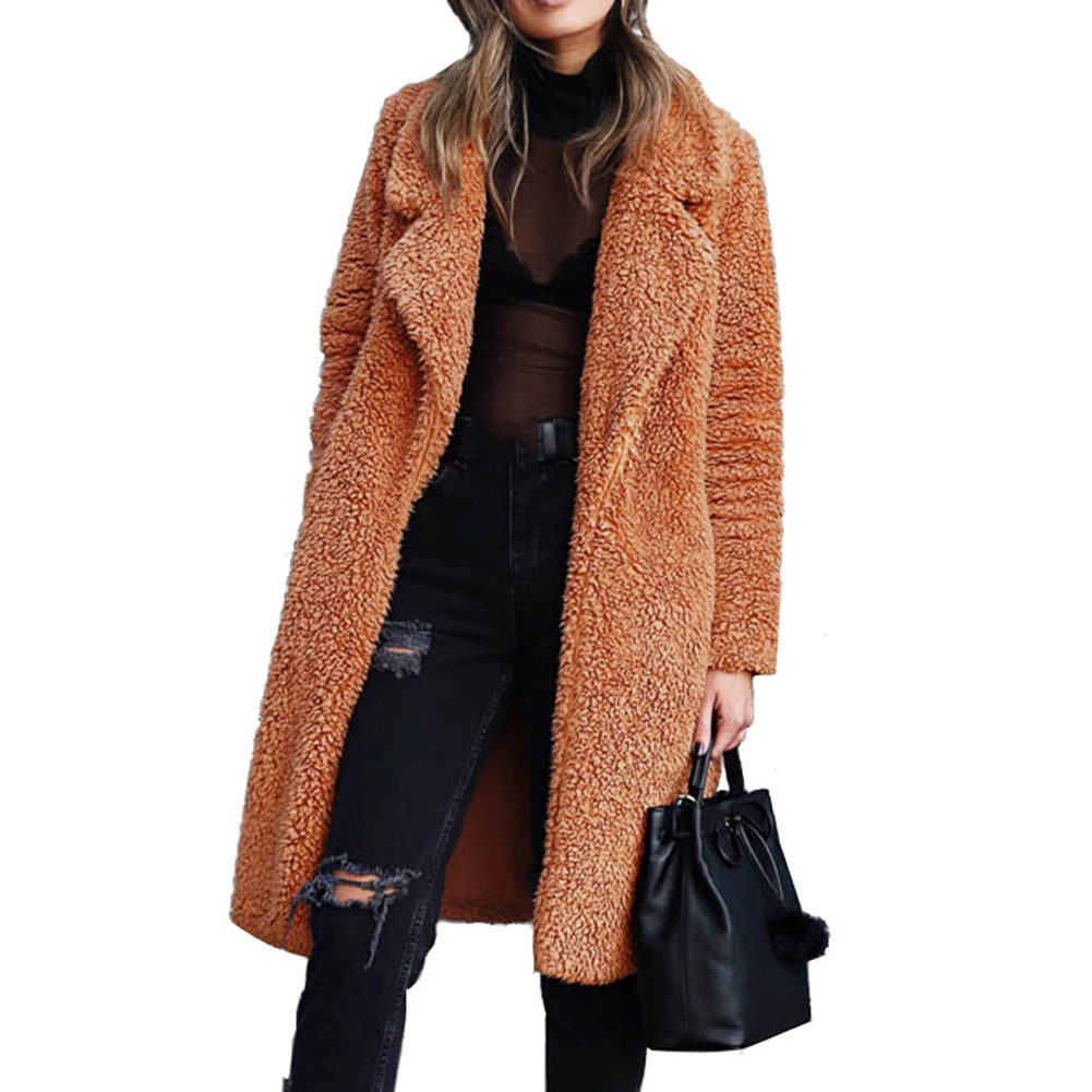 Женское зимнее пальто из плотного плюша с лацканами, однотонный теплый кардиган с длинным рукавом, пальто средней длины из полиэстераспандекса, Женское пальто