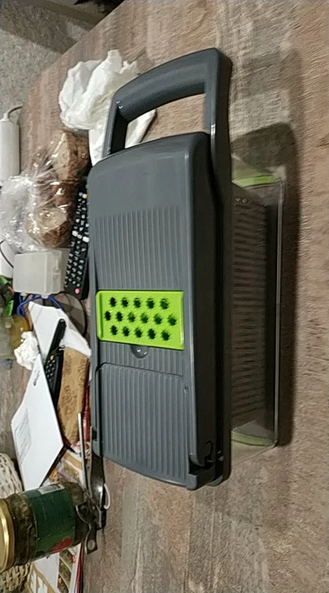 Хорошая тёрка. Пластик добротный. Довольно толстый. Как покажет в работе - ещё не знаю. Но на вид смотрится солидно. ps Пока распаковывал/рассматривал, случайно коснулся ножа, и палец слегка порезал. Так что аккуратнее - ножи очень острые.