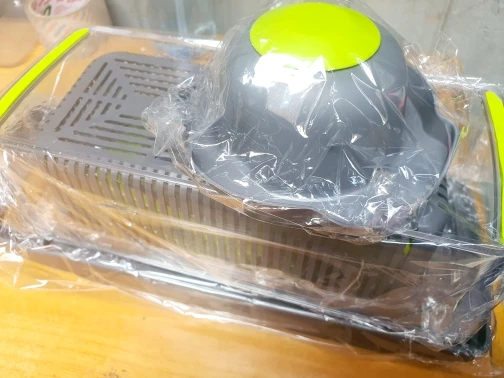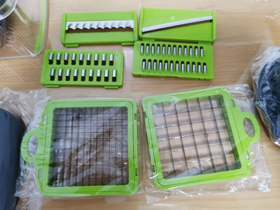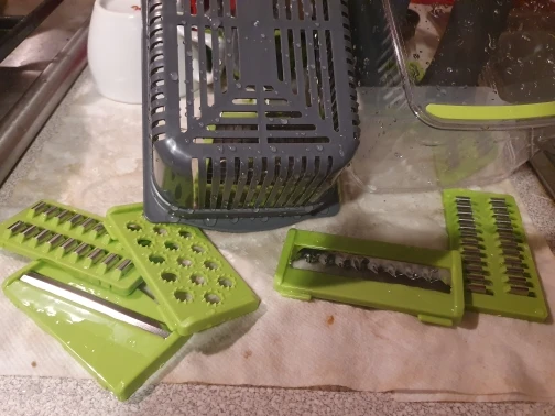 Тертушками ще не користувалися, але салати вже робили. Прикольний ґаджет) Давно хотіла собі якусь таку фігню) Виконано солідно, під розпродаж 11.11 взяла за 60 злотих. Доставка до Вроцлава менше двох тижнів. Упакована в повітряний пакет На фото помідори, перець, огірки порізані на більшій сітці і цибуля на дрібнішій.