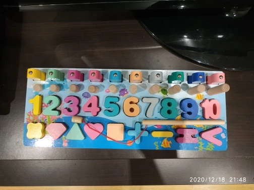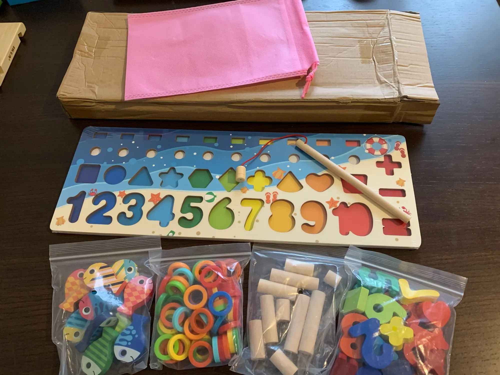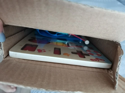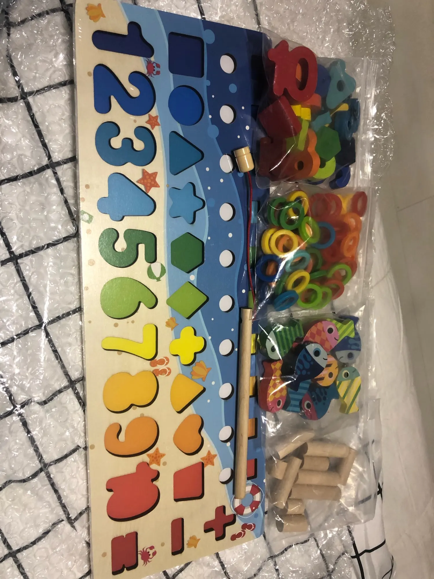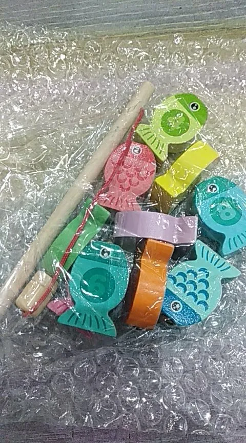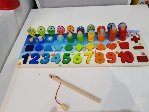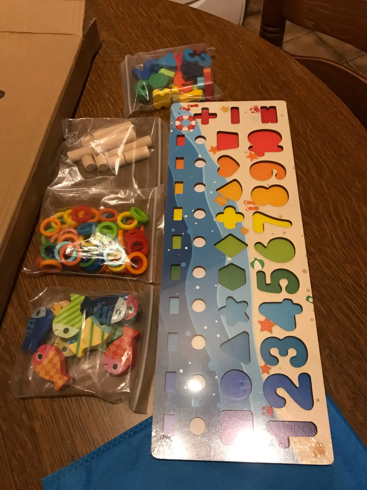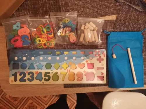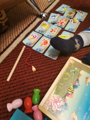 Доставили в пункт выдачи. Отличная игра. Можно играть с цилиндрическими рыбками, вставлять и вынимать их удочкой из отверстий (вокруг них ободки разного цвета, т.е. рыбок можно по цветам раскладывать). Вторая игра - с плоскими рыбками и карточками, мой ребёнок уже довольно шустро их совмещает, очень нравится. Пока любимая игра.
