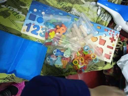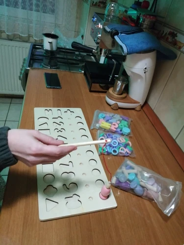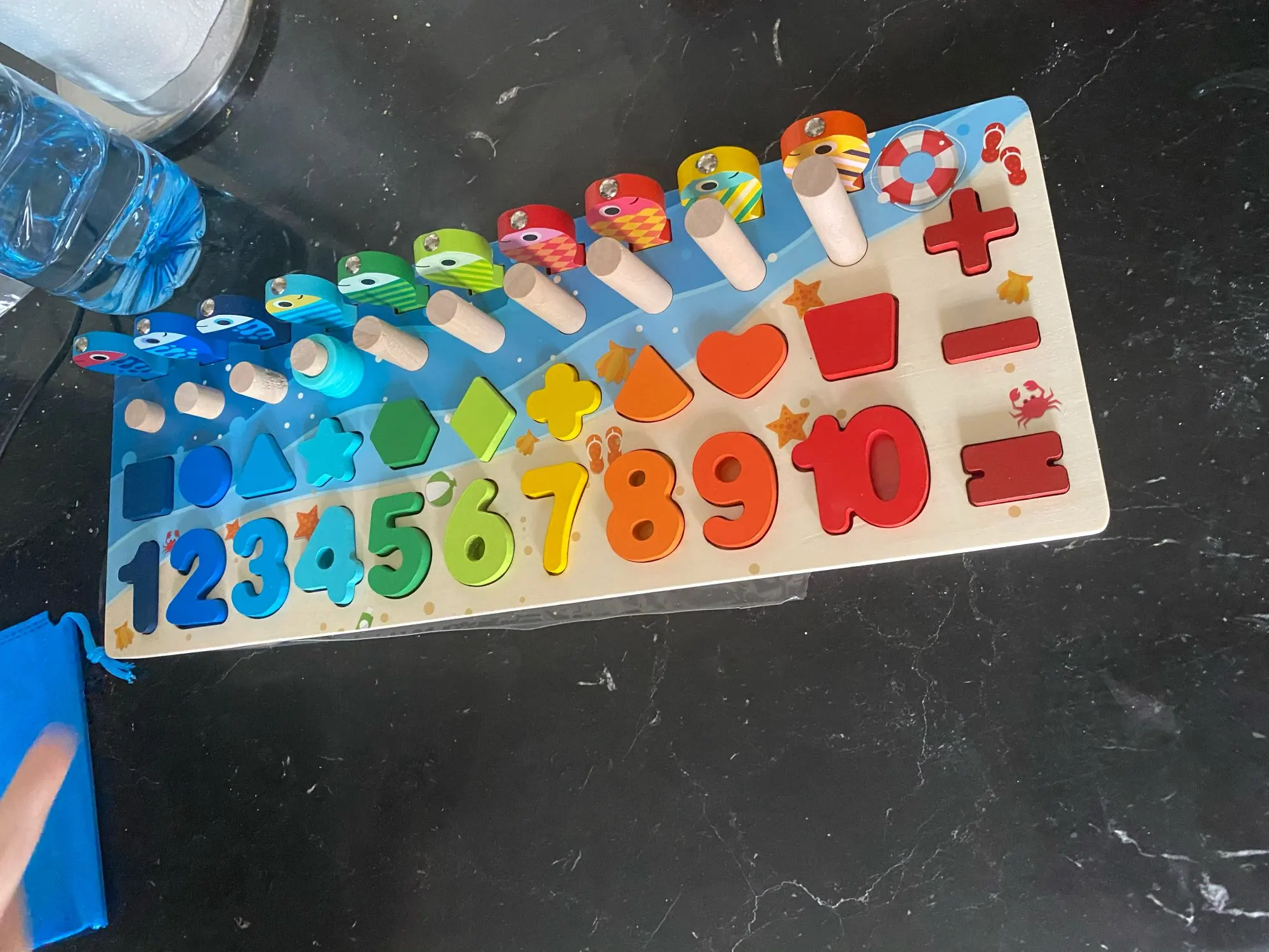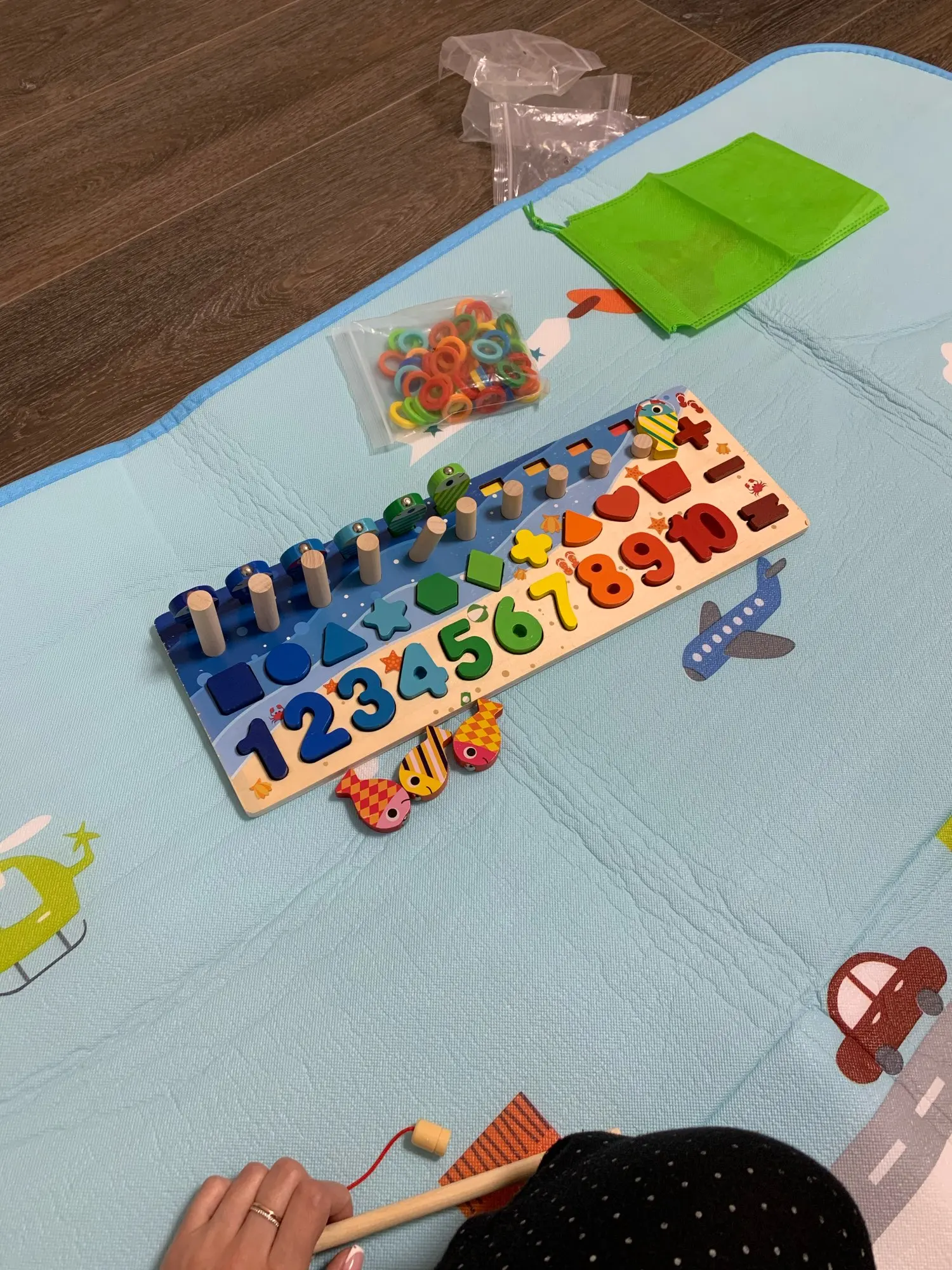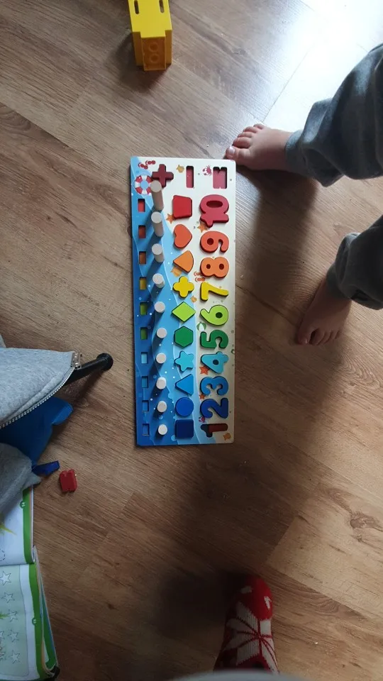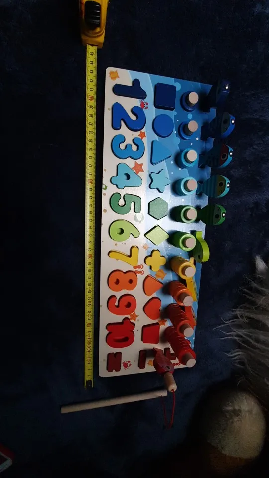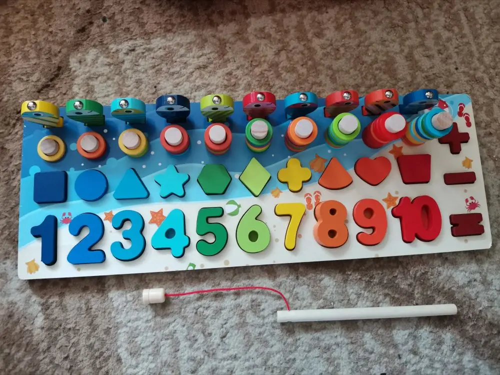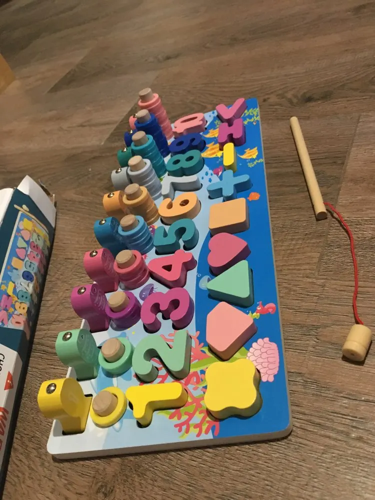 Доставили в пункт выдачи. Отличная игра. Можно играть с цилиндрическими рыбками, вставлять и вынимать их удочкой из отверстий (вокруг них ободки разного цвета, т.е. рыбок можно по цветам раскладывать). Вторая игра - с плоскими рыбками и карточками, мой ребёнок уже довольно шустро их совмещает, очень нравится. Пока любимая игра.