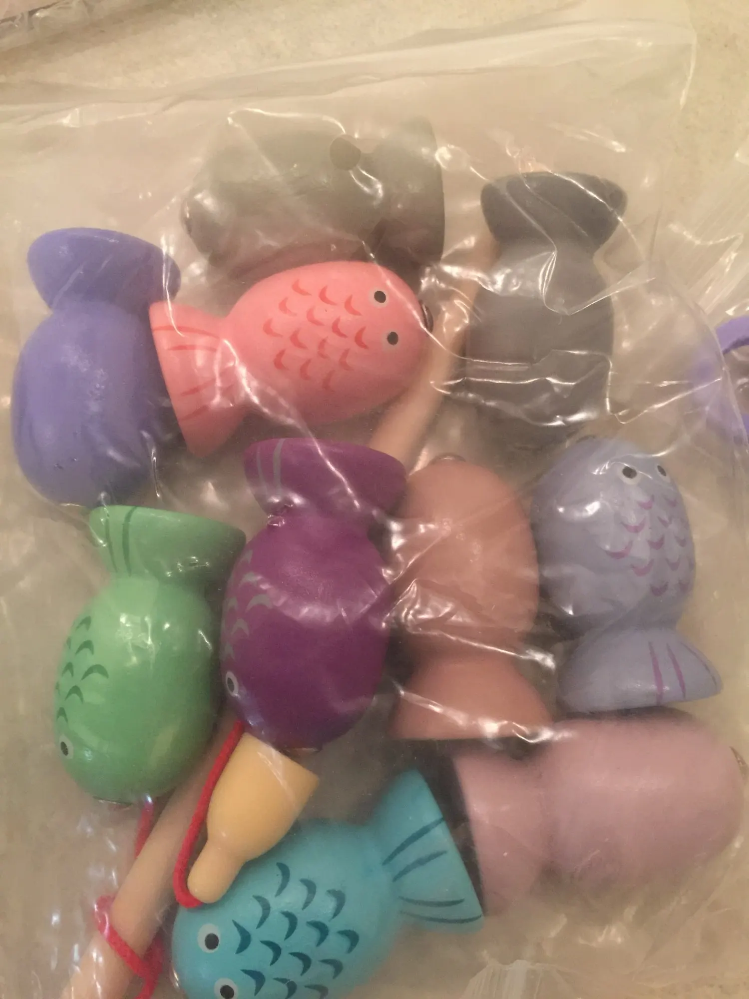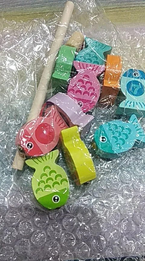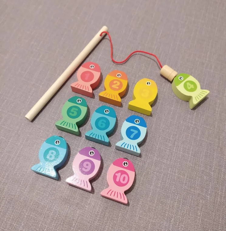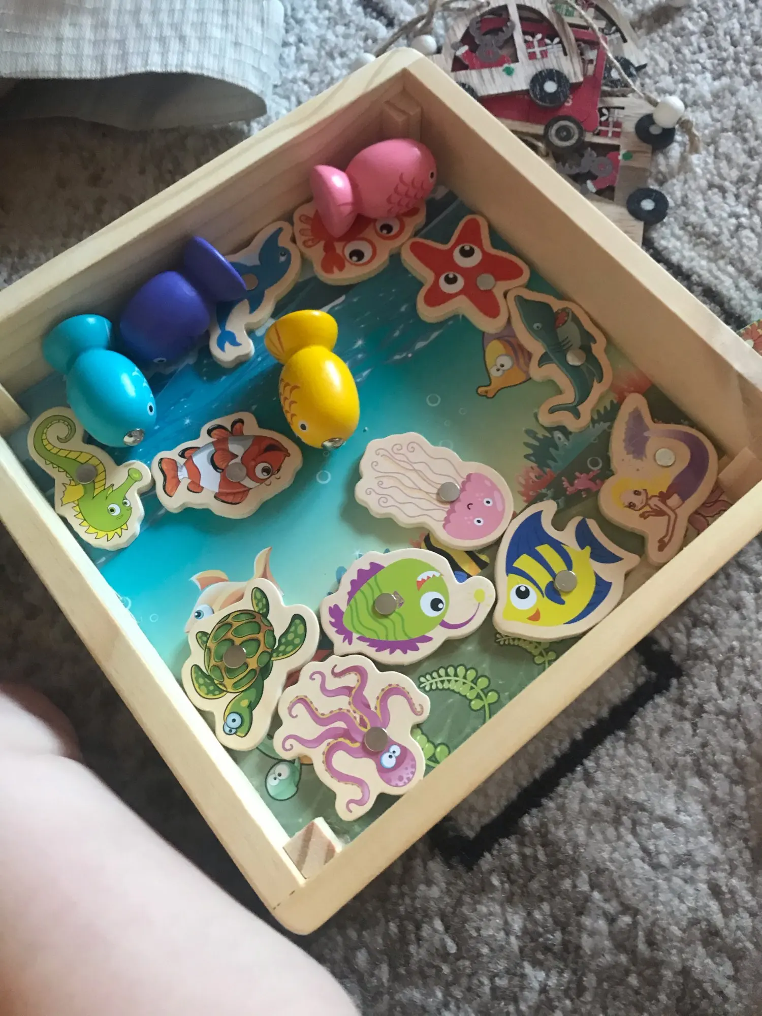 Замечательный игровой набор! В комплекте два вида фигурок с магнитиками - плоские морские обитатели и стоячие разноцветные рыбки, две удочки с магнитными "крючками" и карточки с морскими обитателями и их названиями (названия на китайском, но вполне можно сверху наклеить русские при необходимости). Магниты достаточно мощные - притягиваются легко. Можно либо вылавливать рыбок из "лунок", поставив на коробку специальную рамочку, либо доставать фигурки со дна. Рекомендую!