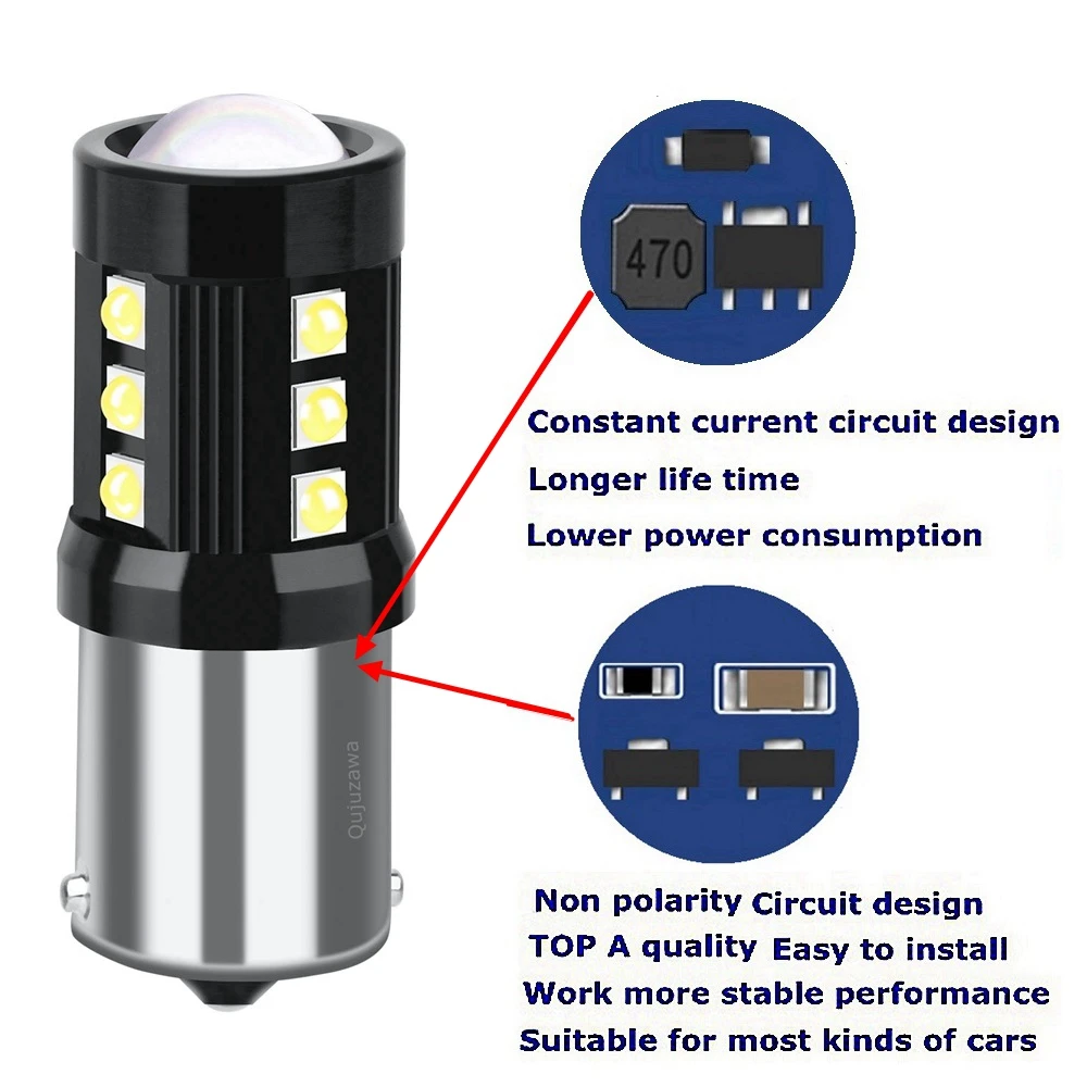 Особенности: Упаковка: 2 светодиодных лампы Преимущество: 360 градусов блеск Корпус: алюминий Напряжение: 12 В постоянного тока Примечание по установке: некоторые модели модифицированного светодиодного сигнала поворота могут быть быстрыми мигающими явлениями, необходимо установить декодер нагрузочного резистора.