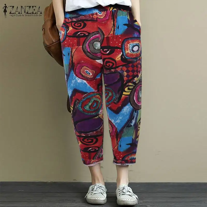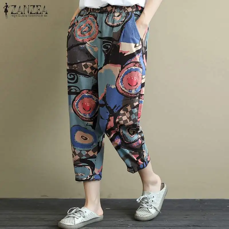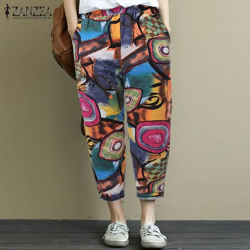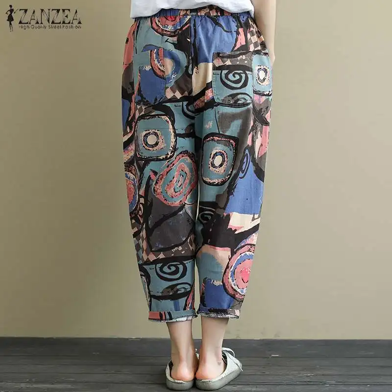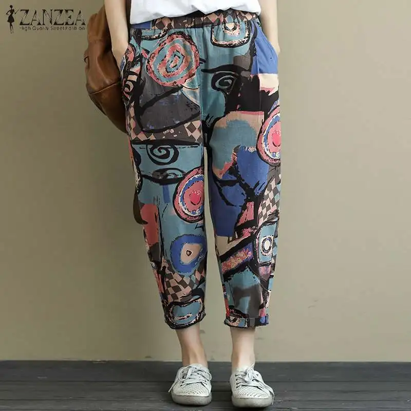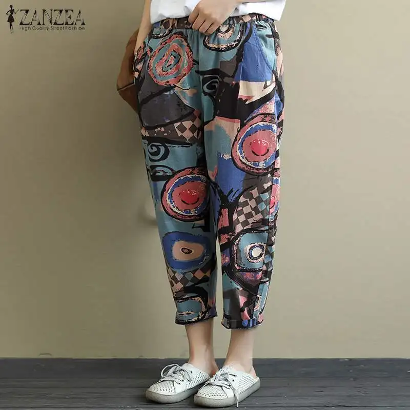 Женские шаровары с винтажным принтом, из хлопка и льна, свободные, большого размера, с эластичной талией, брюки-шаровары