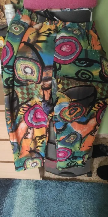 В целом симпотичные брюки. Размер 3хл на русский 56. Если вы ближе к 58 лучше взять 4хл. По длине на рост 164 как полноразмерные брюки, подворота нет как на фото модели. Думаю отрежу см 5, чтобы стали выше щиколотки. В живую цвет более зелёный, чем на фото.