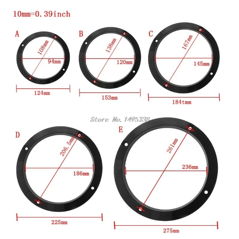 Спецификация: Основной материал: металлическая холоднокатаная сталь Материал круга: АБС-пластик Тип: аудио автомобиля Цвет: черный Внешний диаметр: 275 мм (10 дюймов)/ 225 мм (8 дюймов)/ 184 мм (6,5 дюйма)/ 153 мм (5 дюймов)/ 124 мм (4 дюйма) Количество: 1 комплект