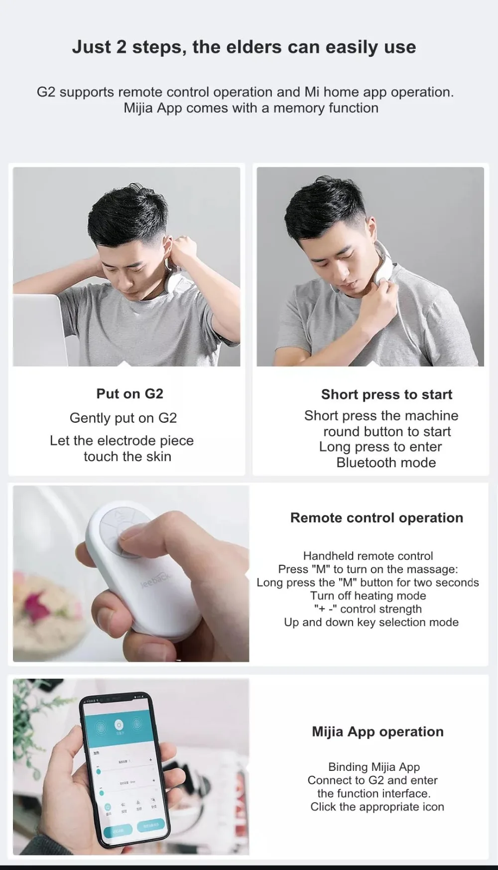 -Свободный контроль черезПриложение Mijia. Пользовательский интерфейс легко понять, и вы можете быстро войти в свой любимый режим массажа. Одним нажатием кнопки «функция памяти», чтобы быстро восстановить настройки, когда G2 был в последний раз использован.