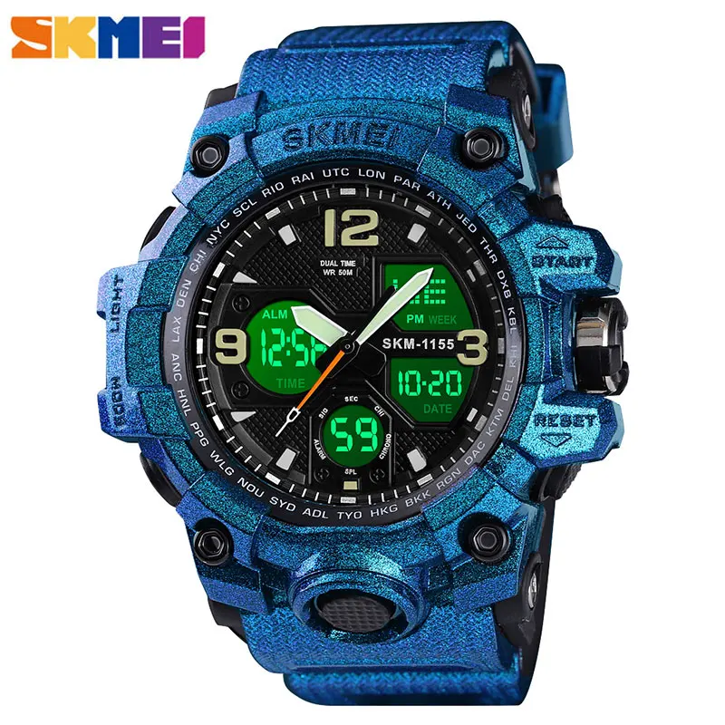 SKMEI новые модные мужские спортивные часы светодиодные спортивные часы кварцевые наручные часы цифровые часы мужские военные водонепроницаемые часы 1155 Бренд: SKMEI 100% новые и высококачественные Кварцевые аналоговые цифровые шоу с функцией EL Водонепроницаемость 50 м, можно плавать с ним. (Пожалуйста, не нажимайте кнопки под водой) Тип: мужские спортивные часы Механизм: оригинальный цифровой механизм Аналоговый и цифровой дисплей с сигнализацией Есть четыре цвета на выбор: черный, синий, красный, золотой Длина Часов: (приблизительно) 26 см Группа Ширина: (приблизительно) 2,2 см Циферблат Диаметр: (приблизительно) 5,5 см Материал ремешка: прочная искусственная кожа Материал корпуса: прочная резина + Высокопрочное закалённое стекло Застежка: Пряжка из нержавеющей стали Вес: около 70 г Примечание: Мы рекомендуем не носить его во время плавания. Но если вы идете плавать или нырять, пожалуйста, не нажимайте кнопки под водой! Компоненты включает в себя: -1x100% натуральная кожа кварцевые часы SKMEI Watch -Руководство по эксплуатации-1 шт.