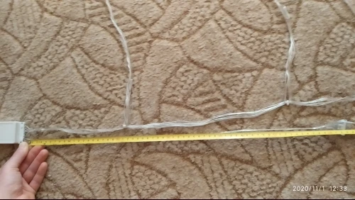Доставка до Алтая из РФ - 8 дней. Реально выглядит как водопад. Размер между светодиодными нитями 33см, от крайней нити до блока управления 21см, длина сетевого шнура 60см. Реальный размер: в ширину- 2,95м, в длину-2,9м (из-за скрученных проводов). С противоположной стороны от блока управления имеется разъем для подключения второй гирлянды. На мой взгляд расстояние между нитями 33см слишком много, если сдвинуть нити между собой до 10-15см эффект водопада смотрится круче. Скорее всего закажу вторую. Рекомендую магазин и товар.
