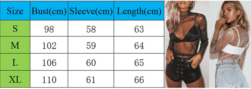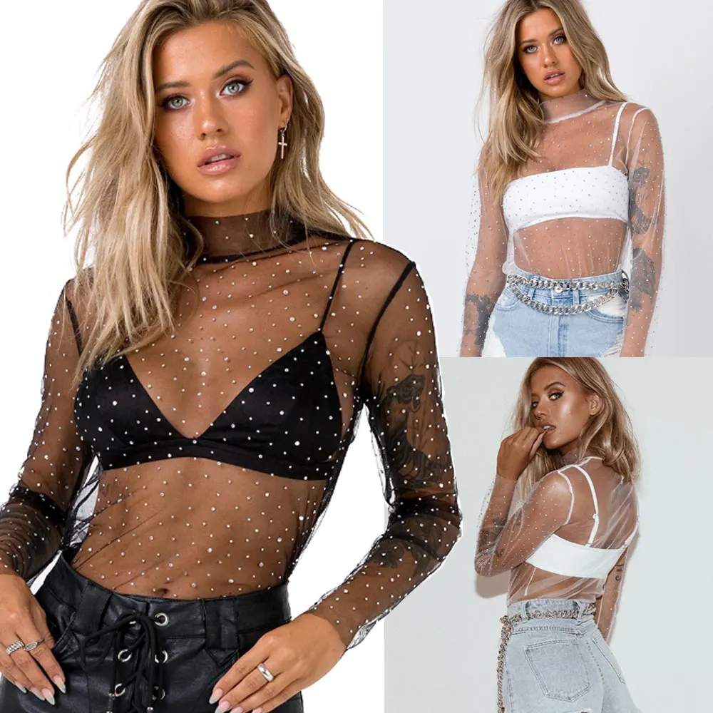 Модные Забавные футболки, женские футболки, прозрачная сетчатая накидка с кристаллами, Прозрачные топы, Топ с длинным рукавом и высоким воротником, черная белая футболка