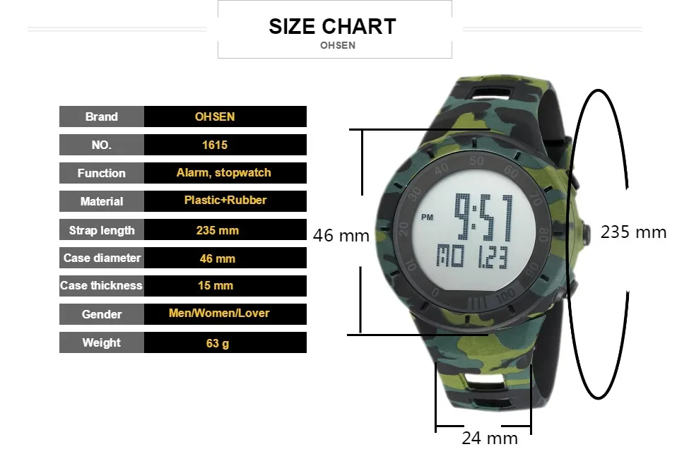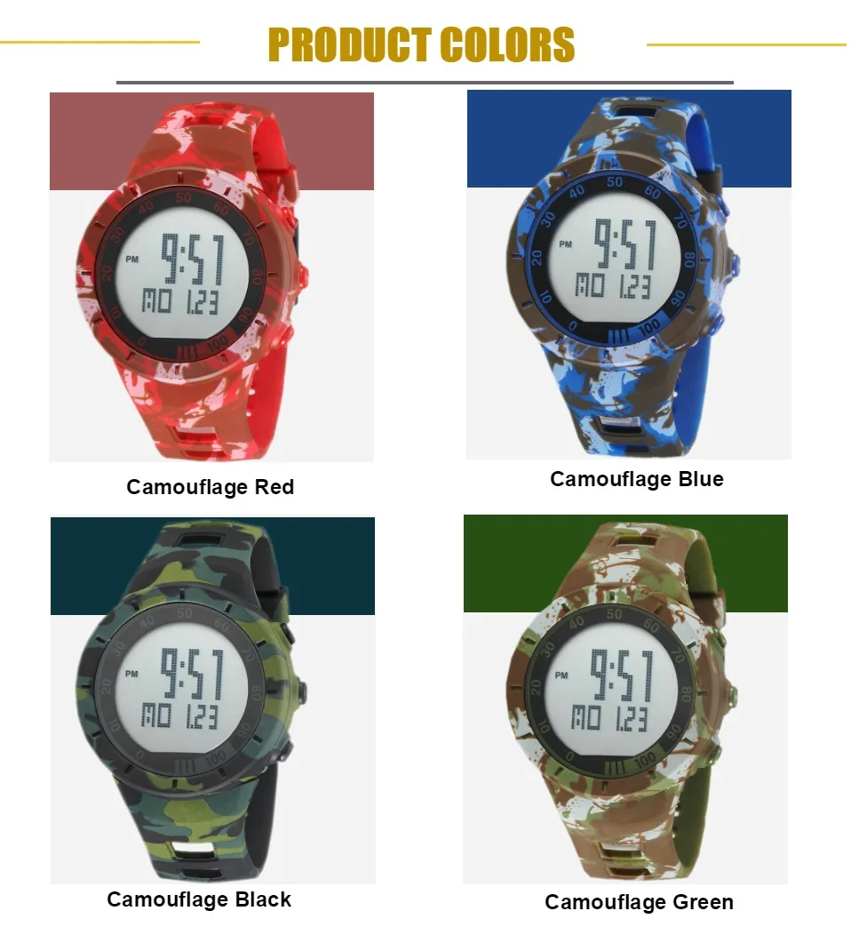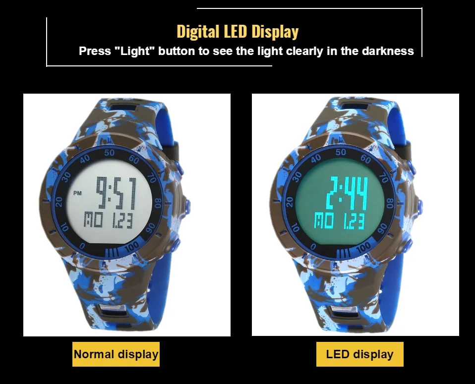 Цифровой: часы, минуты, секунды, pm, месяц, дата, день12/24 часовой формат оповещения и функция ежечасного сигналаСпециальная конструкция с хронографом (секундомером) с шагом 0,01 секундыГлубина водонепроницаемости-до 50 м (не нажимайте кнопки в воде)Дополнительная функция подсветильник Ки ЖК-дисплея для четкого отображения времени в темноте
