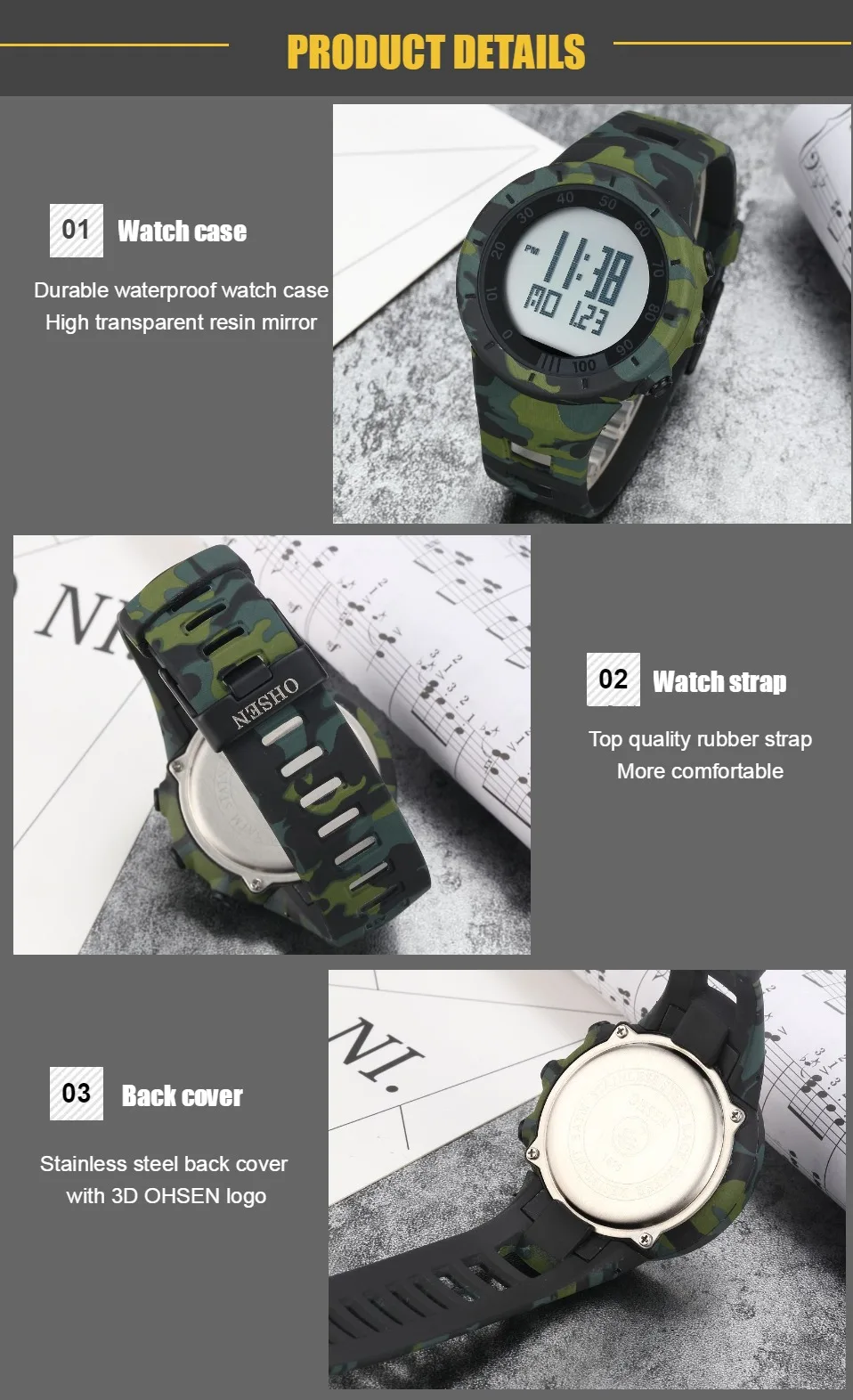 Japan Maxell button cell, более длительный срок службы, задняя крышка из нержавеющей стали с 3D логотипом OHSENРезиновый ремешок хорошего качества, более удобный