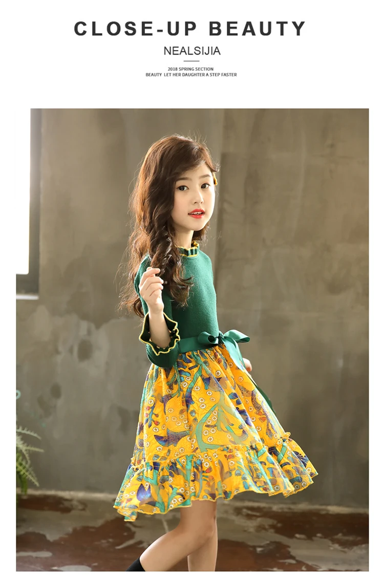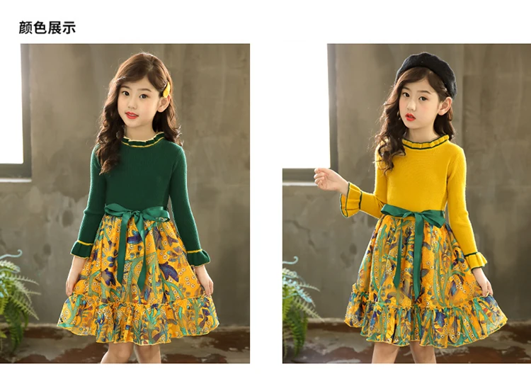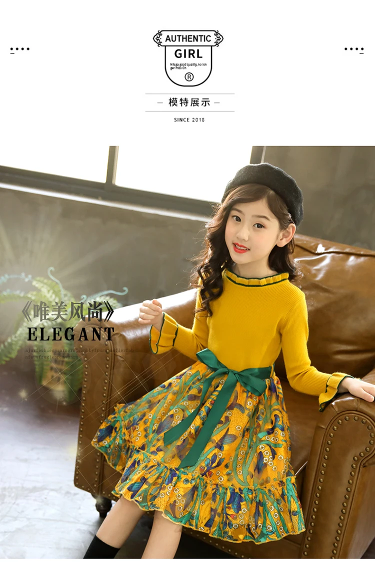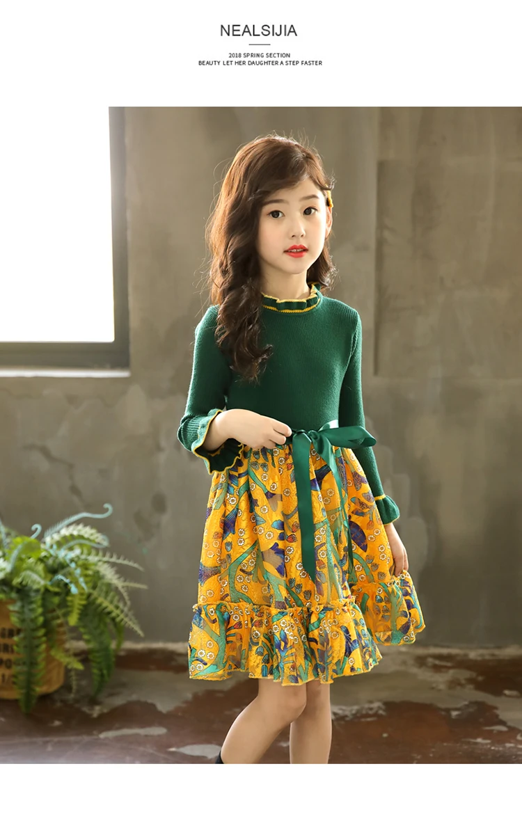 Платье для девочек с цветочным узором, вязаное платье для девочек, повседневные Детские вечерние платья в стиле пэчворк, зимняя детская одежда для девочек 4, 5, 7, 9, 11, 13 лет