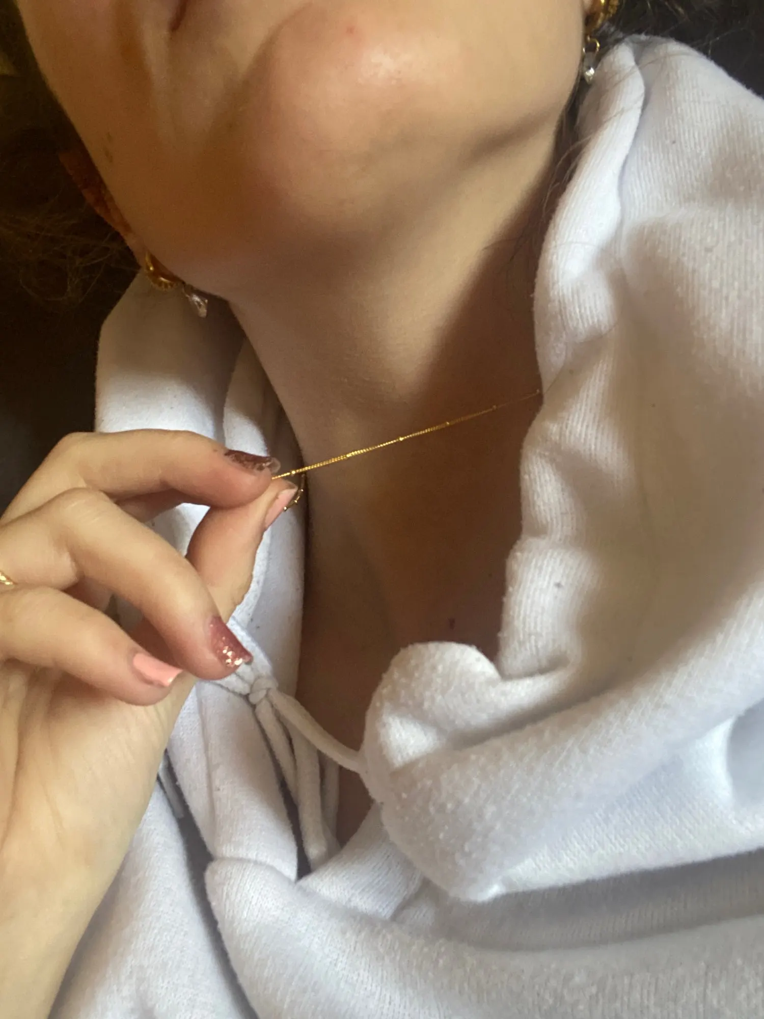 Само изделие выглядит нежно.. длина, цвет.. притензий нет. Единственный недостаток, звенья перекручиваются, образуя, как бы, заломы.. нужно цепочку покрутить в пальцах, чтоб звенья стали на место.. и так постоянно. Если одеть и не обращать внимания, то можно носить. На моем фото видно. Цепочка очень тонкая, нежная, 40 см.