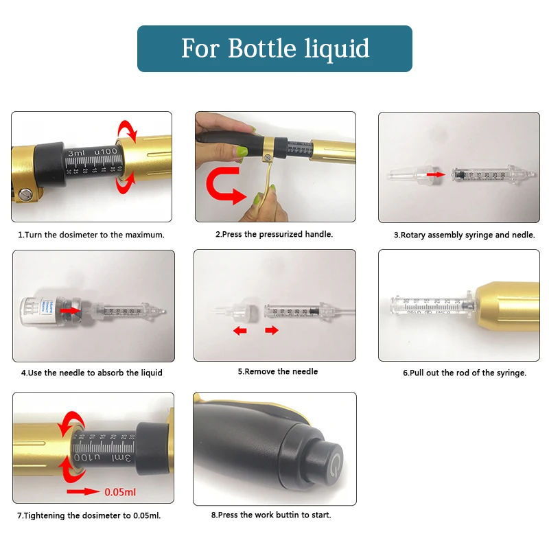 Что такое ручка гиалурона?Водная мезотерапия заключается в впрыскивании гиалуроновой кислоты в кожу. Гиалуроновая кислота содержит влагу, в 200-300 раз более богатая, чем тело. Благодаря чему кожа становится гладкой, мягкой, яркой и увлажненной после инъекций. Для того, чтобы сохранить кожу увлажненной, дамы всегда выбирают различные продукты по уходу за кожей. На самом деле, продукты по уходу за кожей только увлажняют влагу на cutin. Так что при размазывании эти продукты не могут глубоко обеспечить влагу для кожи. Как мы знаем, акне, морщинки и неэластичность появятся, если кожа не будет влагой. Водная мезотерапия решает все проблемы из-за отсутствия влаги, таких как шеллоидная кожа, цветовое пятно, морщинки... И он обеспечит влагу для дермы. Поэтому водная мезотерапия хорошо работает на отбеливании, увлажнении и обновлении неэластичности. Характеристики:Название продукта: ручка для инъекций гиалуронаМатериал: нержавеющая сталь 304Особенности: морщинки, подтяжки лица, подтяжки кожи и т. Д. Особенности:-Помогает уменьшить пятна, морщины и следы. Функция подтягивания и наполнения-Увеличение уровня коллагена для создания новой и молодой кожи, что обеспечивает омоложение кожи.-Улучшает кожу, восстанавливает эластичность кожи, улучшает старение.-Может сделать Антивозрастные продукты попадают в глубину кожи, не повреждая кожу, без побочного эффекта, безопасно для использования.-Глубокое Пополнение и богатое питание, укрепляет кожу, чтобы впитать продукт красоты.-Он используется для более чем 10000 инъекций, и Он управляется самоприводной пружиной.-Быстрая инъекция менее 1/3 секунды, микро отверстие и автоматическое пружинное давление делают инъекции безопасными и безболезненными-Удалите меланин в теле, улучшите темную и желтую кожу, сделайте кожу яркой и белой.