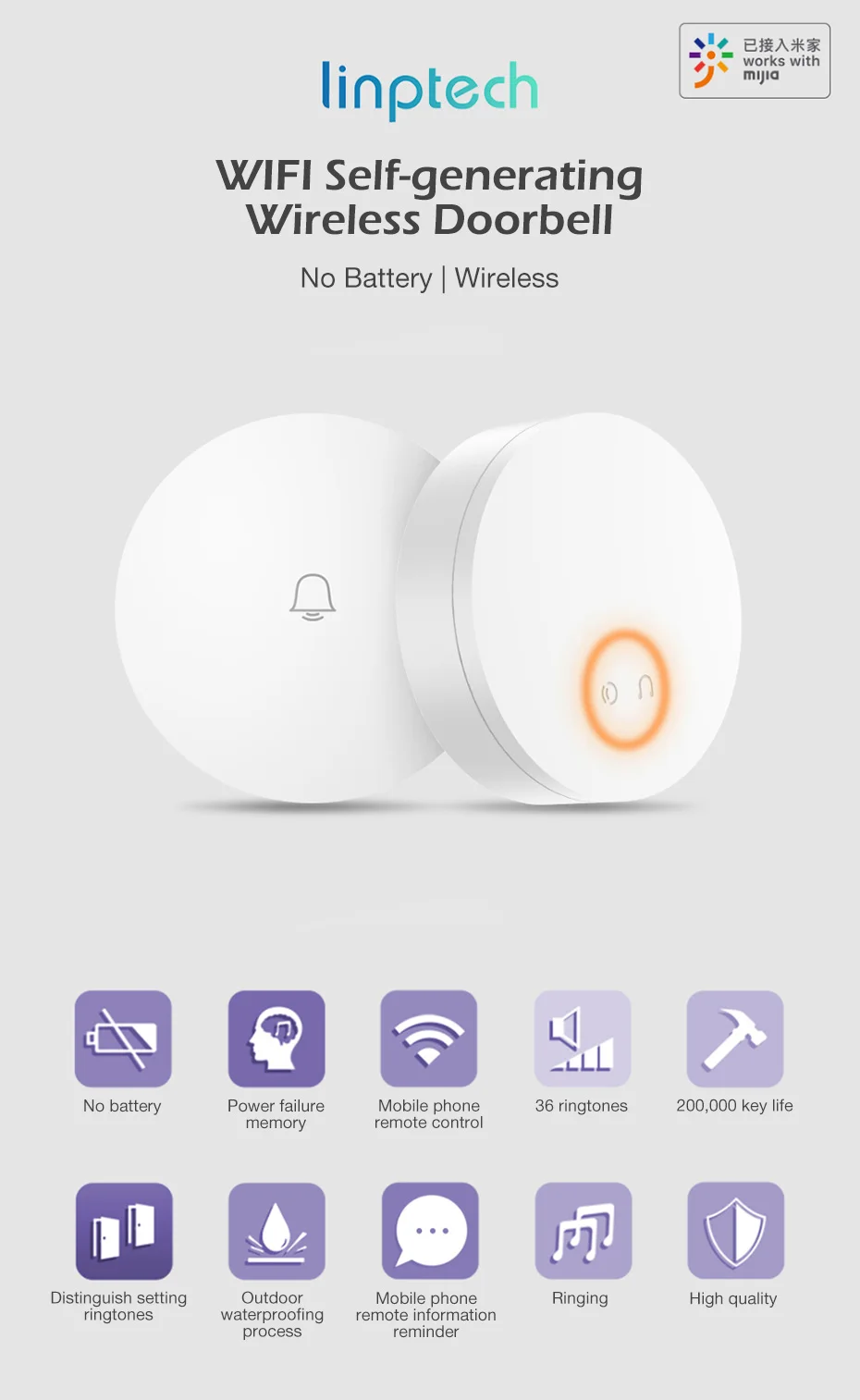 Автономный энергосберегающий беспроводной дверной звонок Youpin, Wi-Fi версия, приложение, умное управление, функция памяти, дверной звонок Linptech для офиса