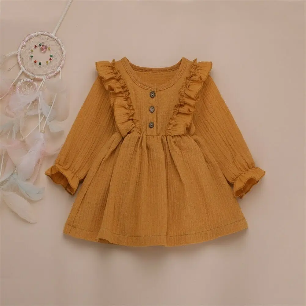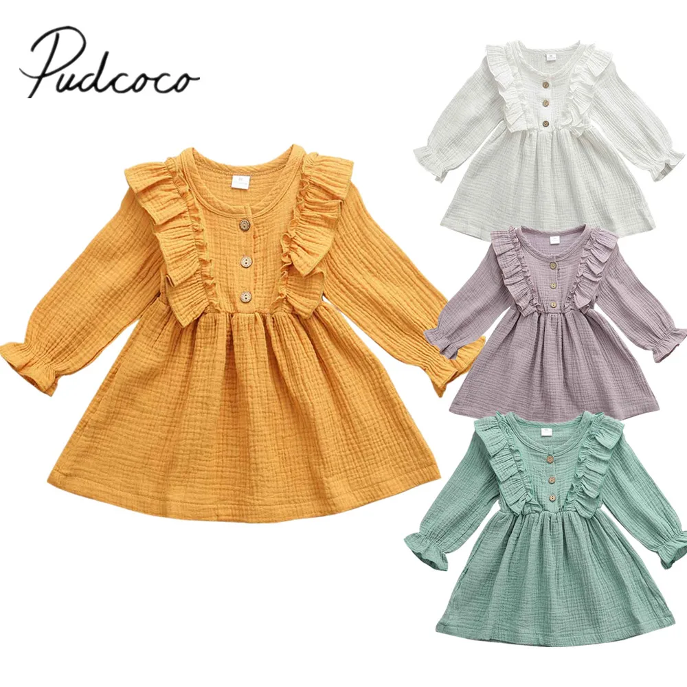 Коллекция 2019 года, весенне-осенняя одежда для малышей, детей, маленьких девочек, хлопковое льняное праздничное Повседневное платье, одежда с длинным рукавом, Однотонный сарафан