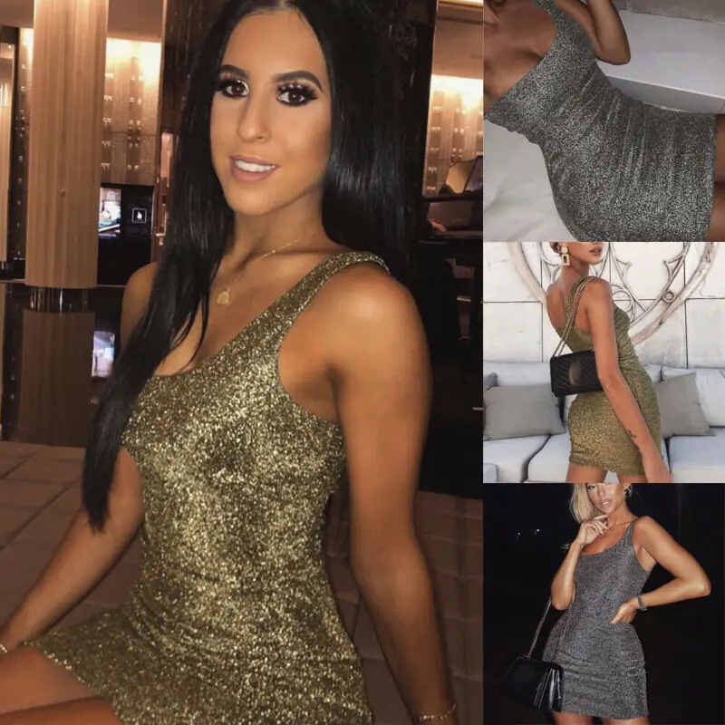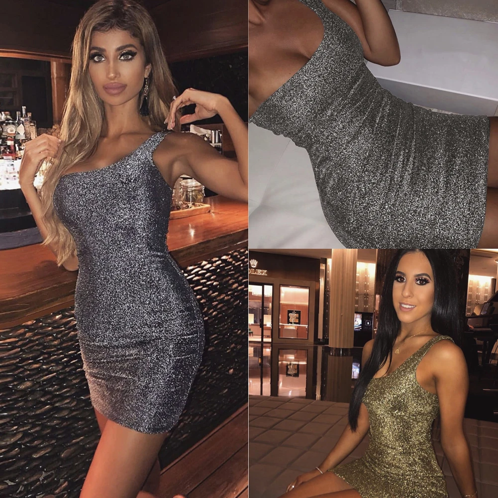 Сексуальное женское роскошное блестящее платье с блестками золотистого и серебристого цвета на одно плечо без рукавов, облегающее Клубное платье, вечерние коктейльные облегающие мини-платья
