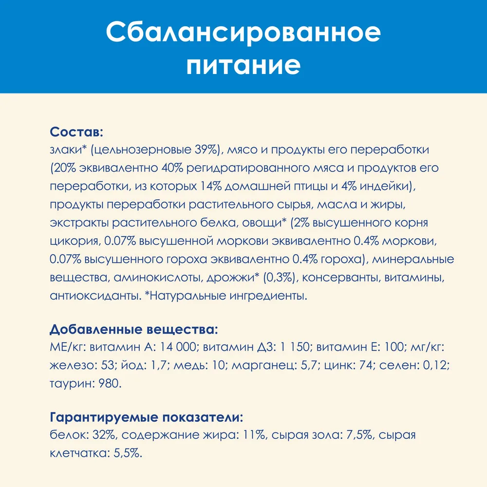 Ваша кошка — уникальное создание. Чтобы она продолжала радовать вас, Purina создала корм Cat Chow® - корм с качественным белком и натуральными ингредиентами (петрушка, шпинат, морковь, цельные зерна злаков, цикорий и дрожжи). Он отличается высоким содержанием домашней птицы и включает Naturium® - особое сочетание волокон из натуральных источников, а также источник натурального пребиотика, который поддерживает здоровое пищеварение кошки. Это позволяет ей питаться с большей пользой. Основываясь на нашей экспертизе с 1926 года, мы разработали полнорационный, сбалансированный корм Purina® Cat Chow®, в котором есть все необходимое, чтобы жизнь вашей кошки была здоровой и естественно прекрасной. Преимущества: – С 1926 года эксперты Purina применяют свои знания и опыт, чтобы создавать полноценное питание для здоровья домашних питомцев – Корм Purina® Cat Chow® бережно приготовлен с натуральными ингредиентами (петрушка, шпинат, морковь, цельные зерна злаков, цикорий и дрожжи) для придания особого аромата, который кошки выбирают инстинктивно – Комплекс Naturium® в кормах Purina® Cat Chow® — это особое сочетание волокон природного происхождения. Он включает источник натурального пребиотика, который, как было доказано, улучшает баланс микрофлоры кишечника и поддерживает здоровье пищеварительной системы кошки. Это позволяет ей питаться с большей пользой. – С витамином E для поддержания естественной защиты организма кошки и витаминами группы B для оптимального использования энергии – БЕЗ добавления красителей, искусственных ароматизаторов и консервантов Рекомендации по кормлению: Значения рассчитаны для кошек с умеренной активностью при нормальной температуре окружающей среды. Индивидуальные потребности могут варьироваться, и кормление должно быть скорректировано для поддержания вашей кошки в оптимальном весе. Следите, чтобы у вашей кошки всегда была чистая свежая питьевая вода. Переводите кошку на корм Purina® CAT CHOW® постепенно в течение 7 дней. Состав: злаки (цельное зерно*), мясо и продукты переработки мяса (20%, эквивалентно 40% регидрированного мяса и продуктов переработки мяса, не менее 14% домашней птицы и 4% индейки), продукты переработки растительного сырья (5,4% сухой мякоти свеклы; 0,07% сухой петрушки, что эквивалентно 0,4% петрушки*), растительные и животные жиры, экстракты растительного белка, овощи* (сушеный корень цикория; сухая морковь; сухой шпинат), консерванты, минеральные вещества, дрожжи*, витамины, антиоксиданты. *Натуральные ингредиенты Страна производства: Россия Условия хранения: В сухом прохладном месте