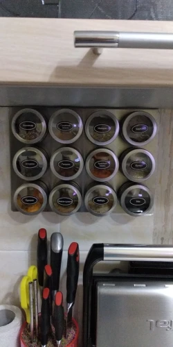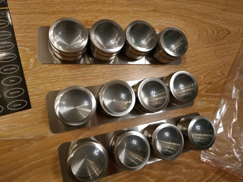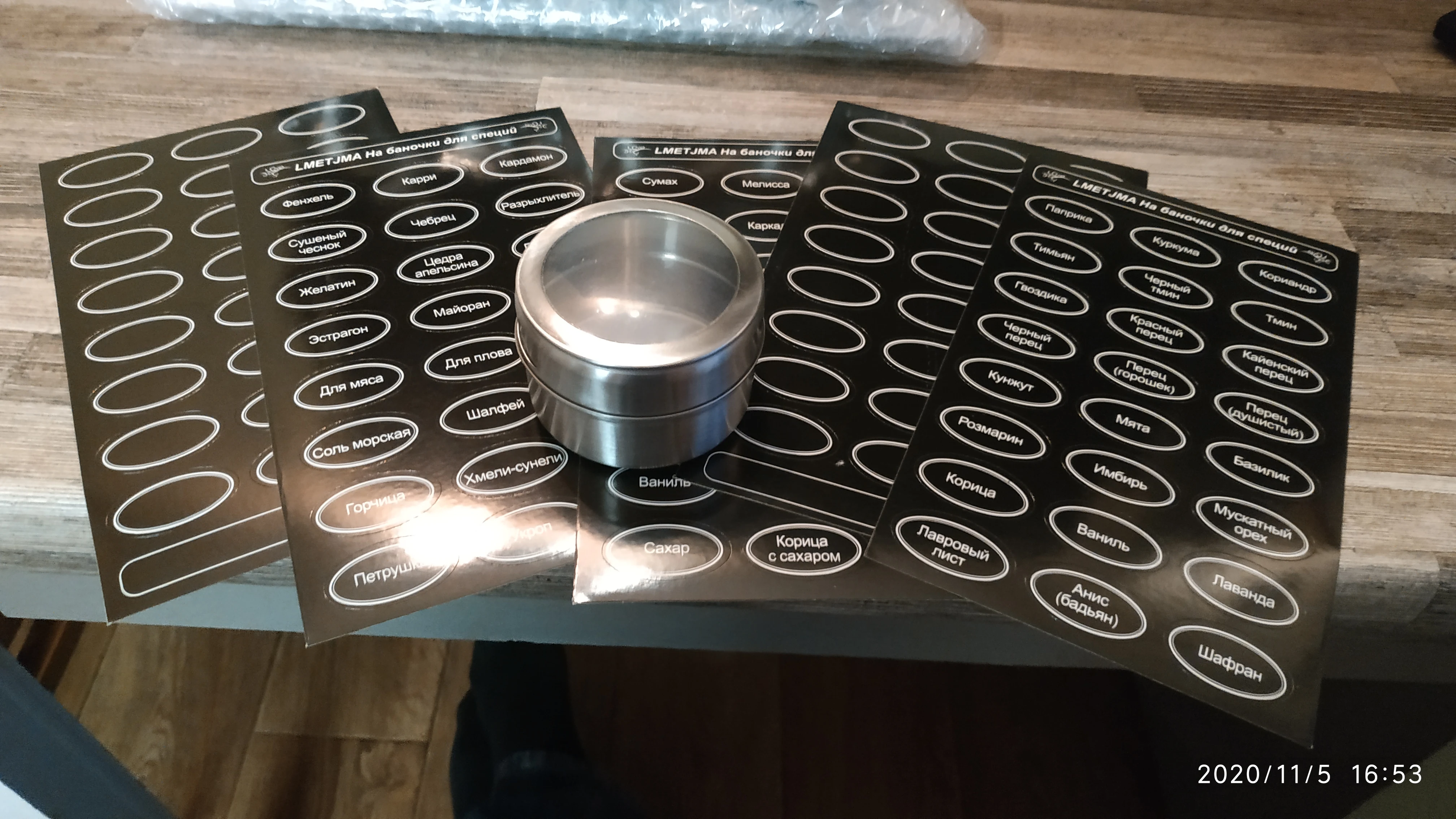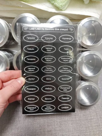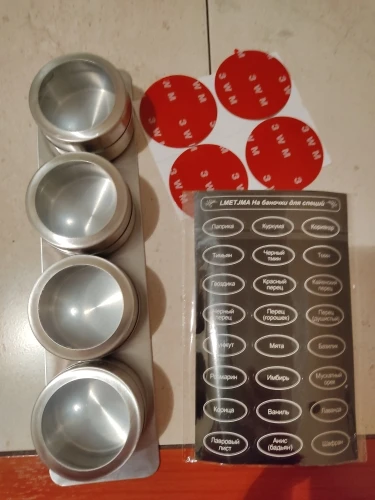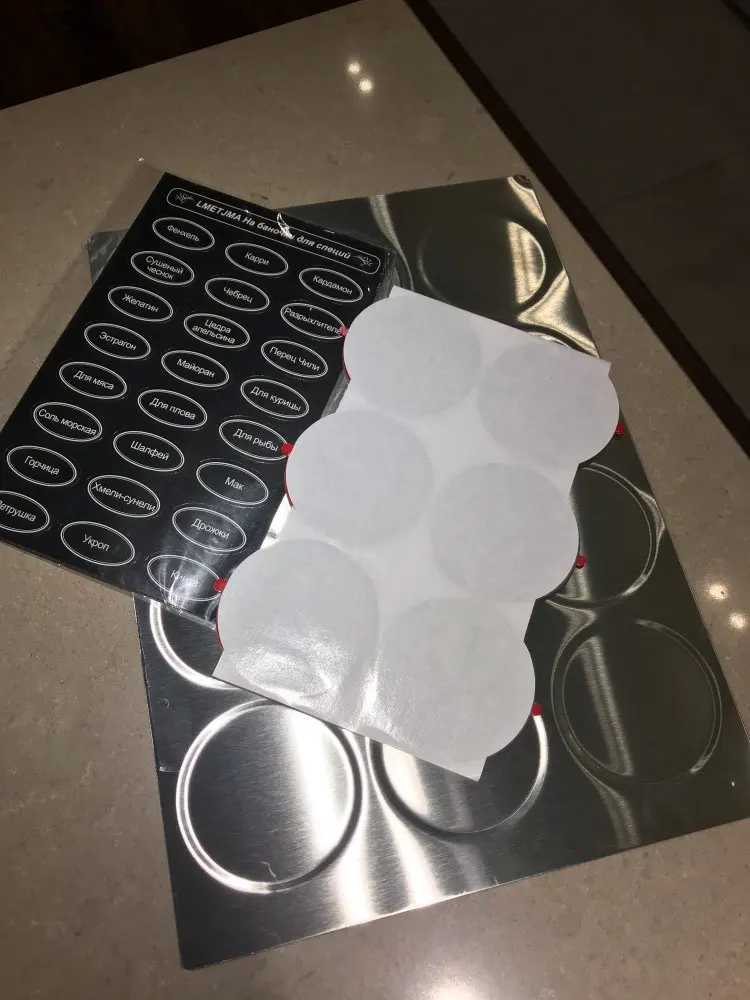 Замечательно упаковано, как снаружи, так и внутри, все подверженные части оклеены плёнкой, продавец позаботился об удобстве использования, ничего дополнительно покупать не надо, всё в наборе. Только белой ручки не хватает:) выглядит отлично, как на картинке, красивый металл и качественный пластик. По использованию так же замечательно, магнит держит вес баночки и специй, если это изменится, отзыв дополню. Много наклеек. Из замечаний: 1) ОЧЕНЬ не хватает стрелочки или точки на месте отверстия на баночке (чтобы знать, куда крутить и откуда посыпется приправа). 2) Пленка отдирается не вся, оставляя следы, но я нашла решение: аккуратно проведите макетным или канцелярским ножом (с хорошим лезвием) прямо по краю пленки (смотрите фото), тогда вы легко уберёте всю плёнку. 3) с точки зрения дизайнерской, было бы ВЕЛИКОЛЕПНО клеить на круглые баночки КРУГЛЫЕ наклейки, может подберете новые наклейки в форме круга, тогда они могли бы выглядеть супер дизайнерскими. Очень советую этого продавца!