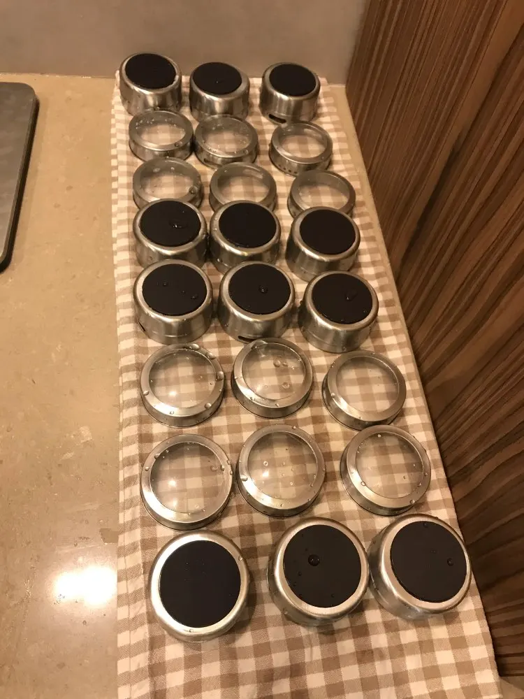 Отличные баночки. Все как в описании. Хороший магнит. Каждое стекло крышки с двух сторон в пленке было. Одна крышка правда спадает. Остальные крепко держатся.