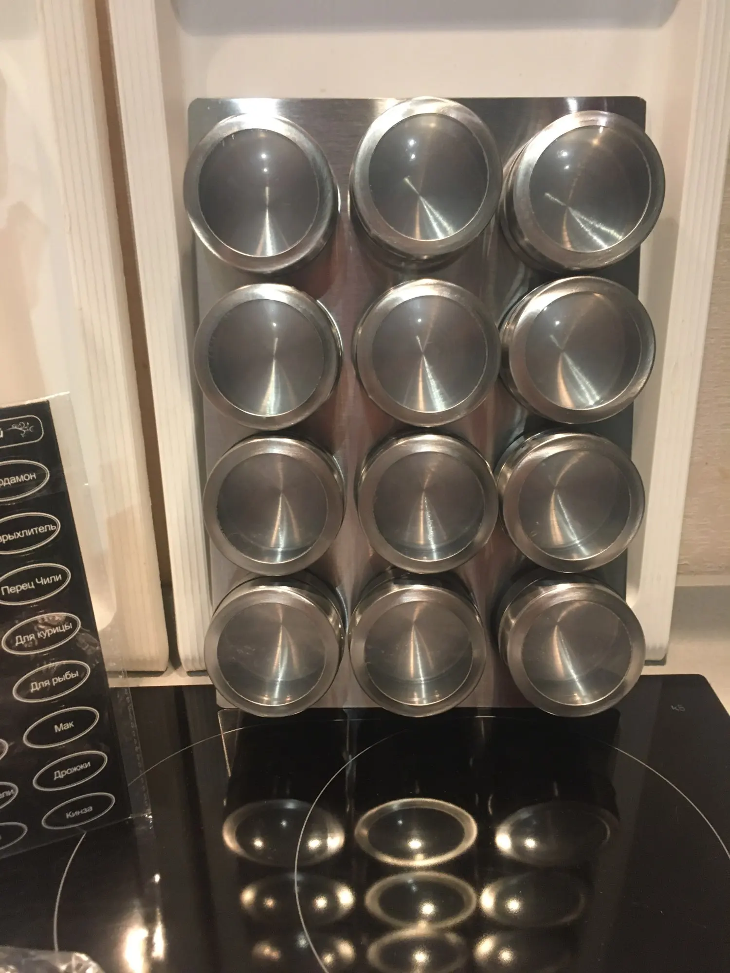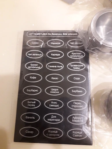 Классные баночки, хорошо упакованы, плёнка на прозрачных элементах с двух сторон, царапин нигде нет. Прицепили пластину с внутренней стороны шкафа, рядом с плитой, супер удобно, можно цеплять на холодильник. Наклейки есть для всех видов специй.