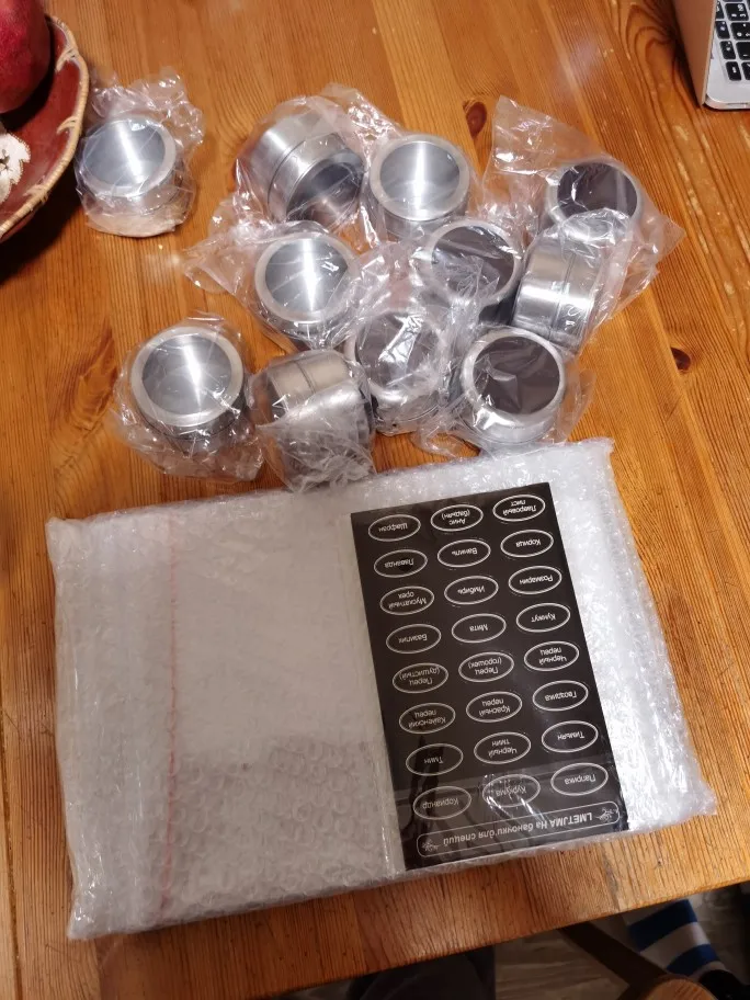 Посылка упакована очень качественно, прислали курьером аж до места работы, на почте не нужно торчать))). Теперь по поводу самих баночек для приправы: баночки закрываются довольно плотно, не хлябают, целые, не мятые, из полированного металла(думал что будет какая-нибудь фольга), что меня приятно удивило!!! Выглядят очень достойно, эстетично, просто класс. Увидел их и сразу понял, что на кухне без них не обойтись, и сразу же купил в качестве подарка жене. самое сложное теперь - это подобрать 12 приправ по цветам, найти фиолетовую приправу и зелёную под цвет кухни. Вывод: покупайте обязательно - не пожалеете, берите в подарок женам, мамам, бабушкам. Стильное дополнение к любой кухне!!!
