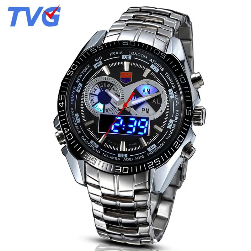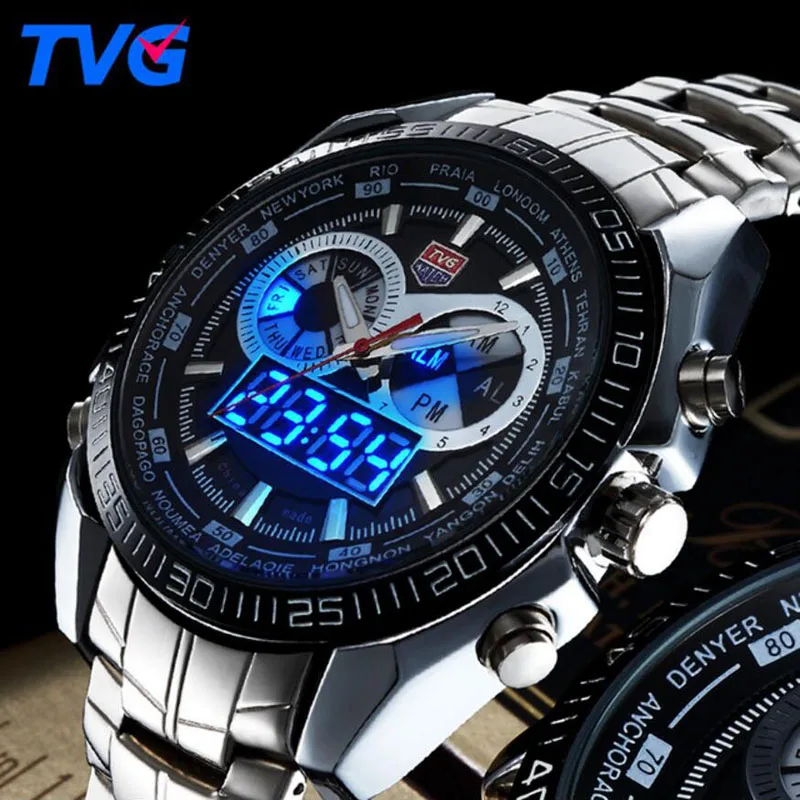 Часы наручные TVG Мужские кварцевые, спортивные светодиодные цифровые аналоговые из нержавеющей стали
