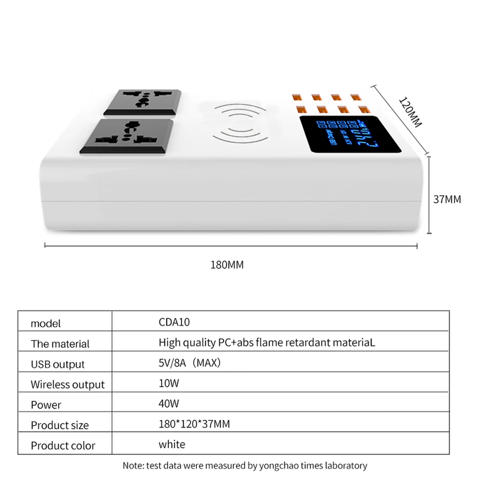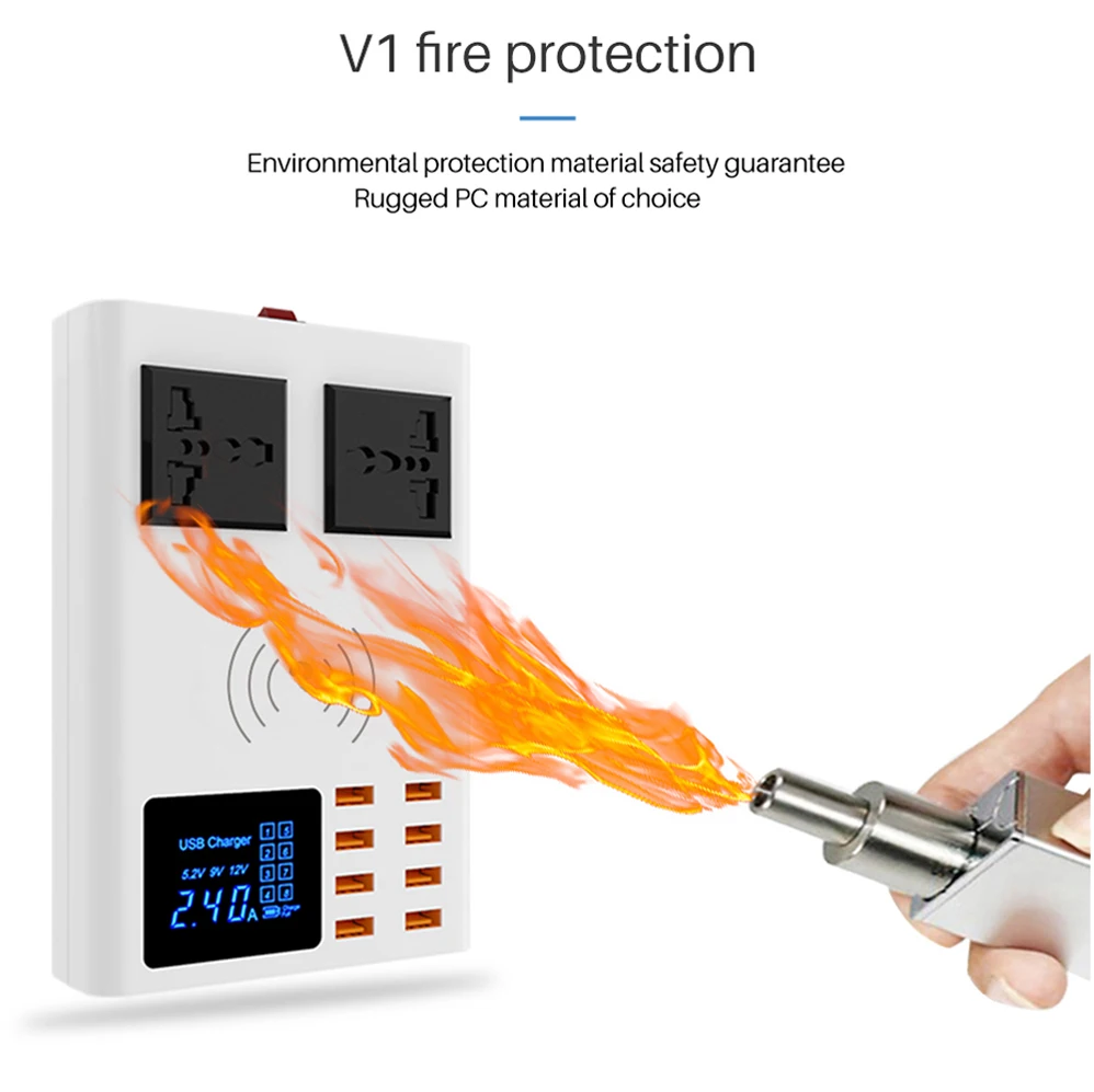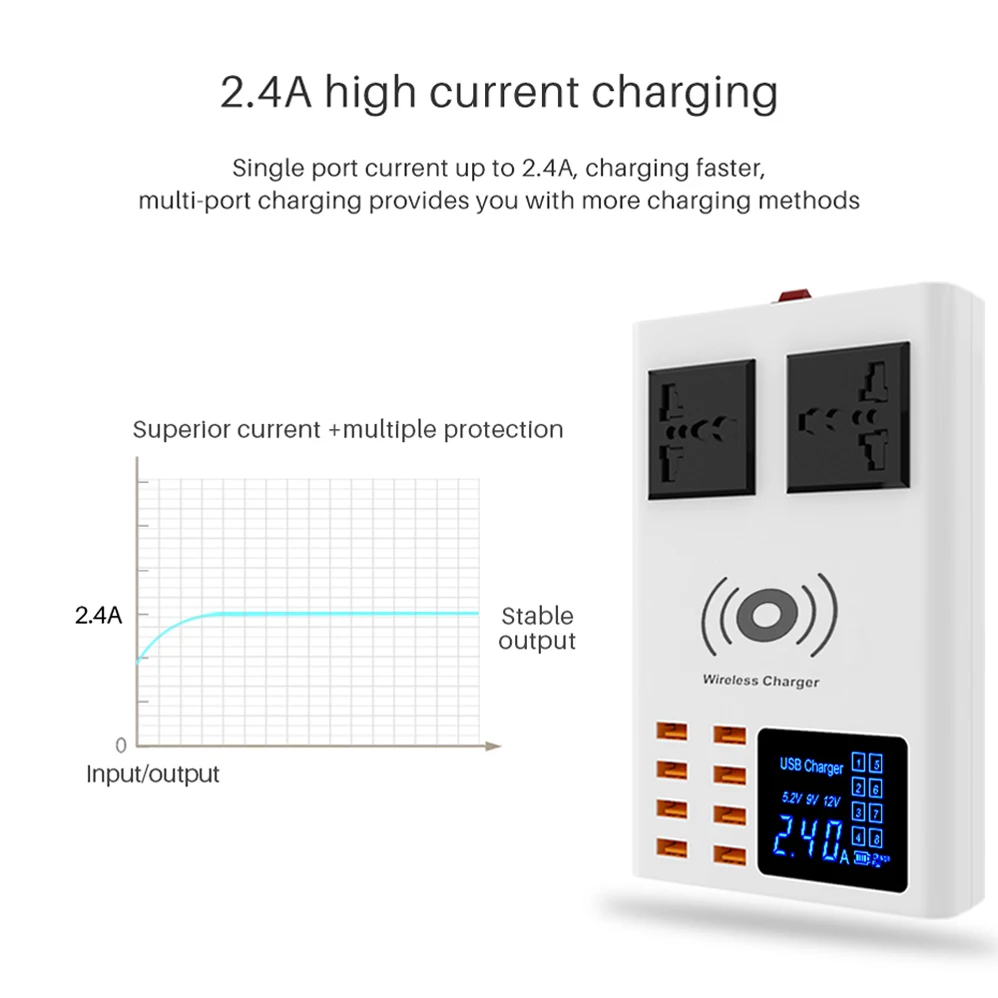 Особенности: Идеально подходит для дома, офиса, путешествий и других помещений 8 usb-портов с беспроводным зарядным устройством различной выходной мощности для удовлетворения ваших потребностей Совместим со всеми смартфонами, такими как iphone, Samsung, Xiaomi, Huawei, LG, ZTE, Lenovo, HTC, Sony, Google и tablet PC, камера, MP3, MP4 плеер, PSP с usb-портом. Поставляется с светодиодный дисплеем для четкого отображения состояния зарядки, поставляется с умным светодиодный экраном для проверки состояния Компактный дизайн, малый размер и легкий вес Автоматическое соответствие току, больше защиты Цвет: белый Стандарт штепсельной вилки: штепсельная вилка стандарта Великобритании, штепсельная вилка стандарта США, штепсельная вилка европейского стандарта (опционально) Материал: АБС-пластик + Поликарбонат Обратите внимание: ток питания относится к вашему кабелю и мобильному телефону, отличается кабелем и разный мобильный телефон, разница в токе зарядки большая, настоящий оригинальный кабель и кабель usb oridinary имеют большую разницу.