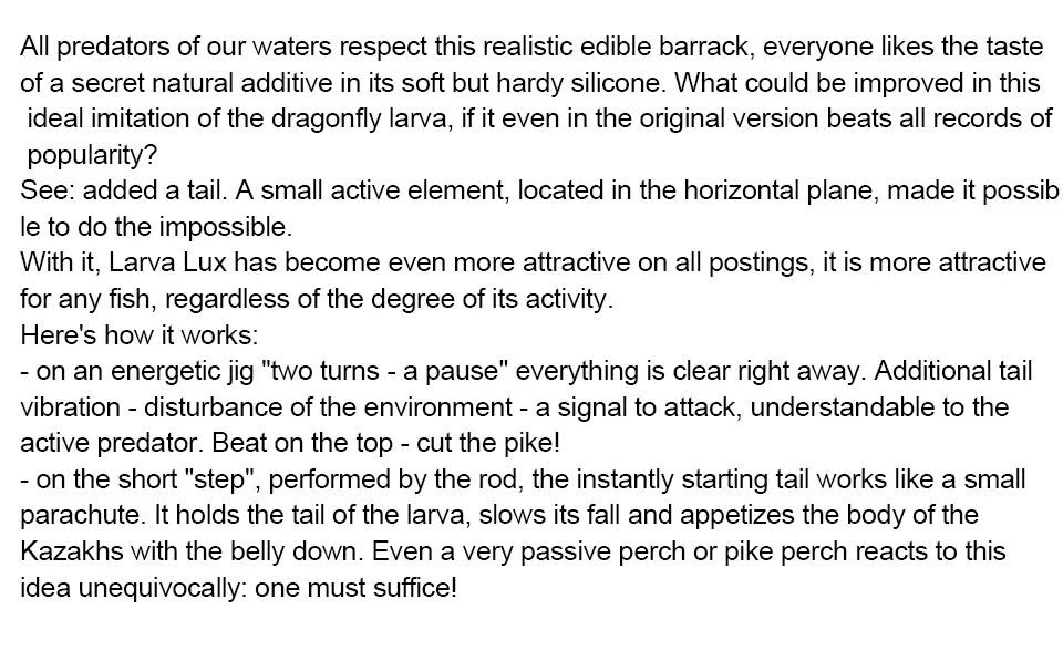 Полностью в соответствии с описанием, очень быстрая доставка, срок получения более чем правильный. Я надеюсь, что они будут настолько же эффективны, как у личинки II, которые я купил и испытал у этого же продавца. Я думаю, что запятая может быть плюс. Я использую эти приманки при падении.
