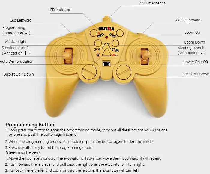 Тип: машинка на радиоуправлении Бренд: HUINA Удельный вес: 1 Особенности: радиоуправление Пульт дистанционного управления: 2,4 ГГц 15CH Расстояние дистанционного управления: выше 50 м Цвет: желтый Материал: АБС, сплав, резина Функции: 680 градусов вращения, вперед/назад, поворот влево/вправо, светодиодный светильник Время работы: около 15-20 минут Время зарядки: около 240 минут Автомобильный аккумулятор: 400mAh 7,2 V батареи (в комплекте) Аккумулятор контроллера: 2 батарейки АА (не входят в комплект) Размер изделия: прибл. 445*170*250 мм Вес изделия: прибл. 1630 г