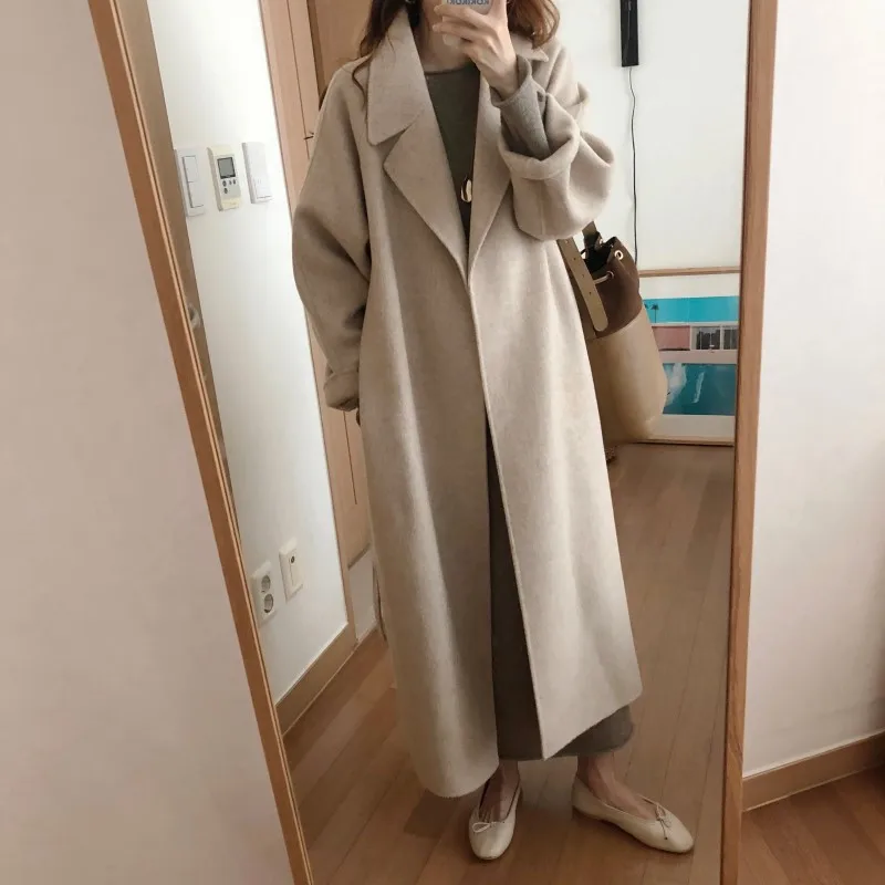 Зимнее женское пальто в Корейском стиле длинное шерстяное пальто, верхняя одежда, свободное размера плюс кардиганы пояса элегантной женской Manteau Femme Hiver P57