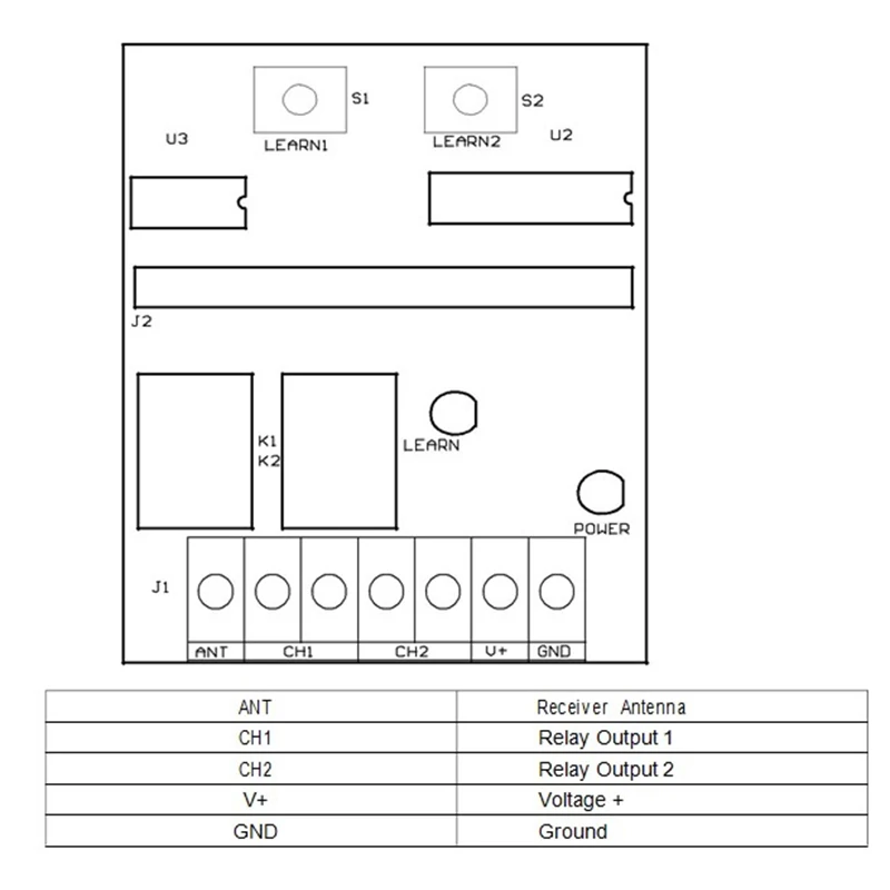 Мгновенная рабочая модель:1. Коды обучающего передатчика:Нажмите «learn 1» или «learn 2» в течение 1 секунды, светильник learn_led, затем, нажмите кнопку, которую вы выбираете на передатчике до вспышки «learn_led» и выйдите, код передатчика сохранен.• Повторите вышеуказанные действия для других передатчиков.2. Стирание кодов передатчика:Нажмите «learn 1» или «learn2» и удерживайте, чтобы сделать «learn _ led светильник до выхода, все коды передатчиков, которые были сохранены, удалены.Антенна ANT - ReceiverCH1-релейный выход 1CH2-релейный выход 2V +-напряжение +GND - Ground