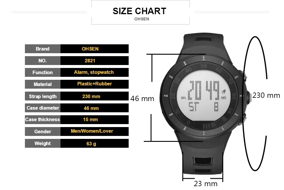 Диаметр корпуса: 46 мм/1,79 дюйма Толщина корпуса: 15 мм/0,58 дюйма Цвет ремешка: как на картинке Длина ремешка: 230 мм/8,97 дюйма (ремешок можно регулировать) Ширина ремешка: 23 мм/0,89 дюйма