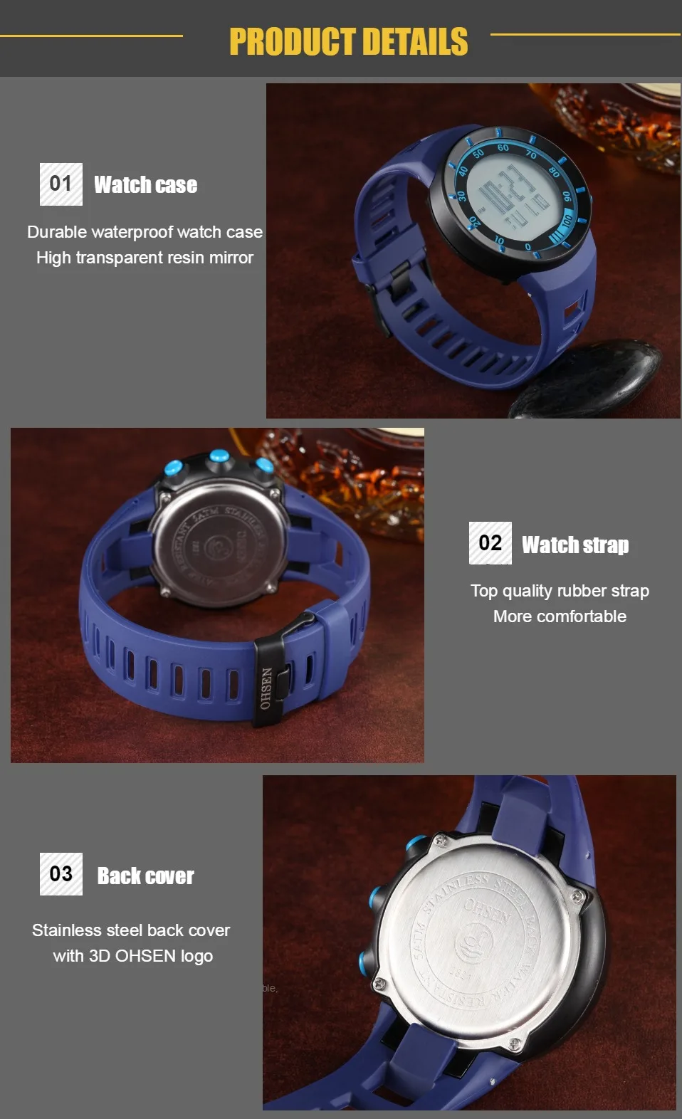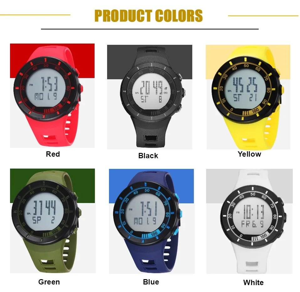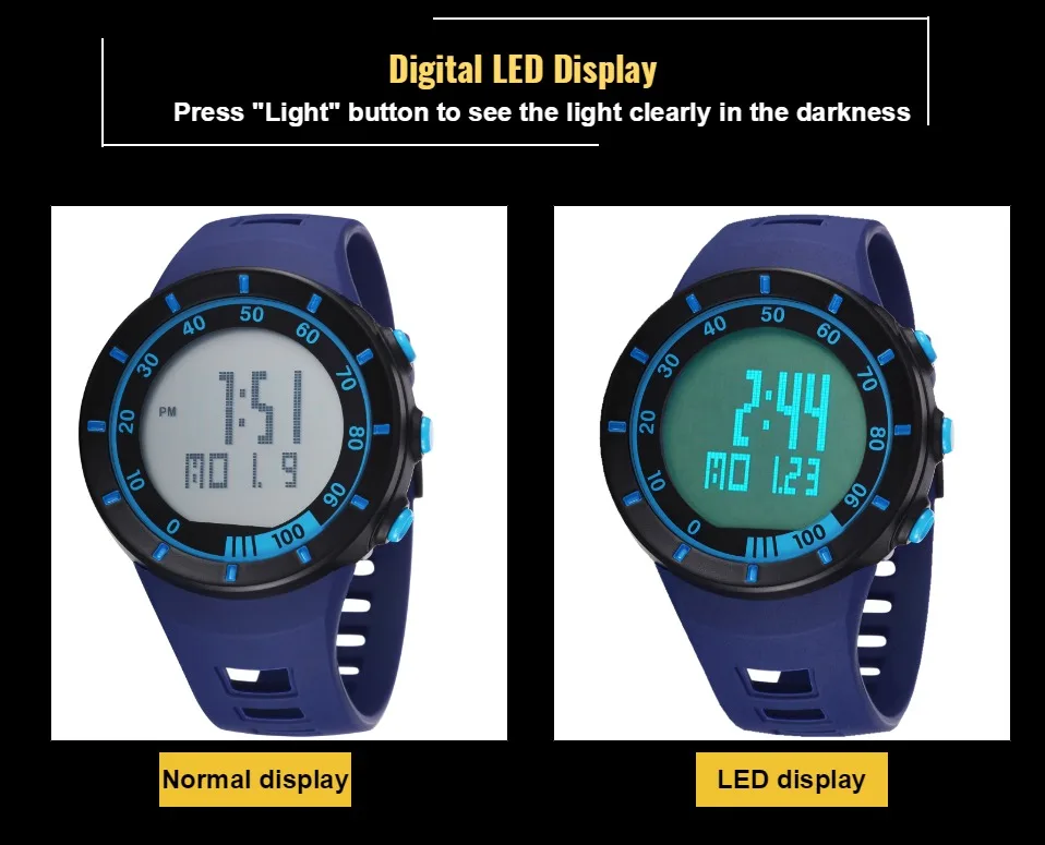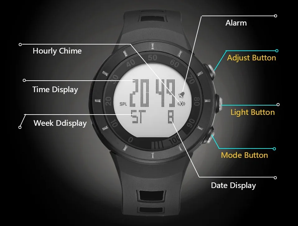 Цифровой: часы, минуты, секунды, pm, месяц, дата, день 12/24 формата отображения времени Функция будильника и ежечасного звонка Специальный дизайн с хронографом (секундомером) с шагом 0,01 секунд Водонепроницаемость до 50 м (не нажимайте кнопки в воде) Дополнительная функция подсветки ЖК-дисплея для четкого отображения времени в темноте Ударопрочный, идеально подходит для занятий спортом на открытом воздухе или в помещении, таких как бег, альпинизм, рыбалка и т. Д.