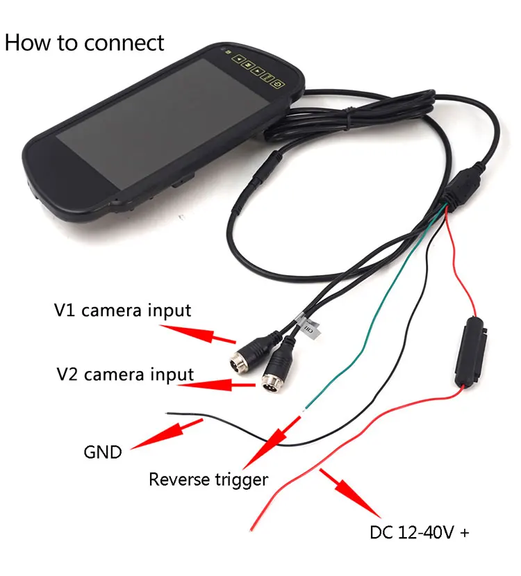 7 "TFT светодиодный зеркальный монитор заднего видаРазрешение: 800 * RGB * 480Соотношение дисплея: 16:9 /4:3Яркость: 300 кд/м2МЕНЮ OSD на английском языке (соотношение яркости/контрастности/цвета/дисплея)Система: PAL/NTSCИсточник питания: 12-40 В постоянного токаМощность: менее 7 Вт2 видео входа (4-контактный разъем), можно подключить с камерой заднего вида/автоматический переключатель при обратной машинеКогда монитор стоит за моделью (экран выключен), он не обеспечивает питание камерыДругой поставщик камера работает, когда монитор стоит рядом.Пульт дистанционного управления и сенсорный ключПростота установки: крепление на оригинальное зеркало автомобиля Аккумулятор дистанционного управления (не входит в комплект): CR2025 3V