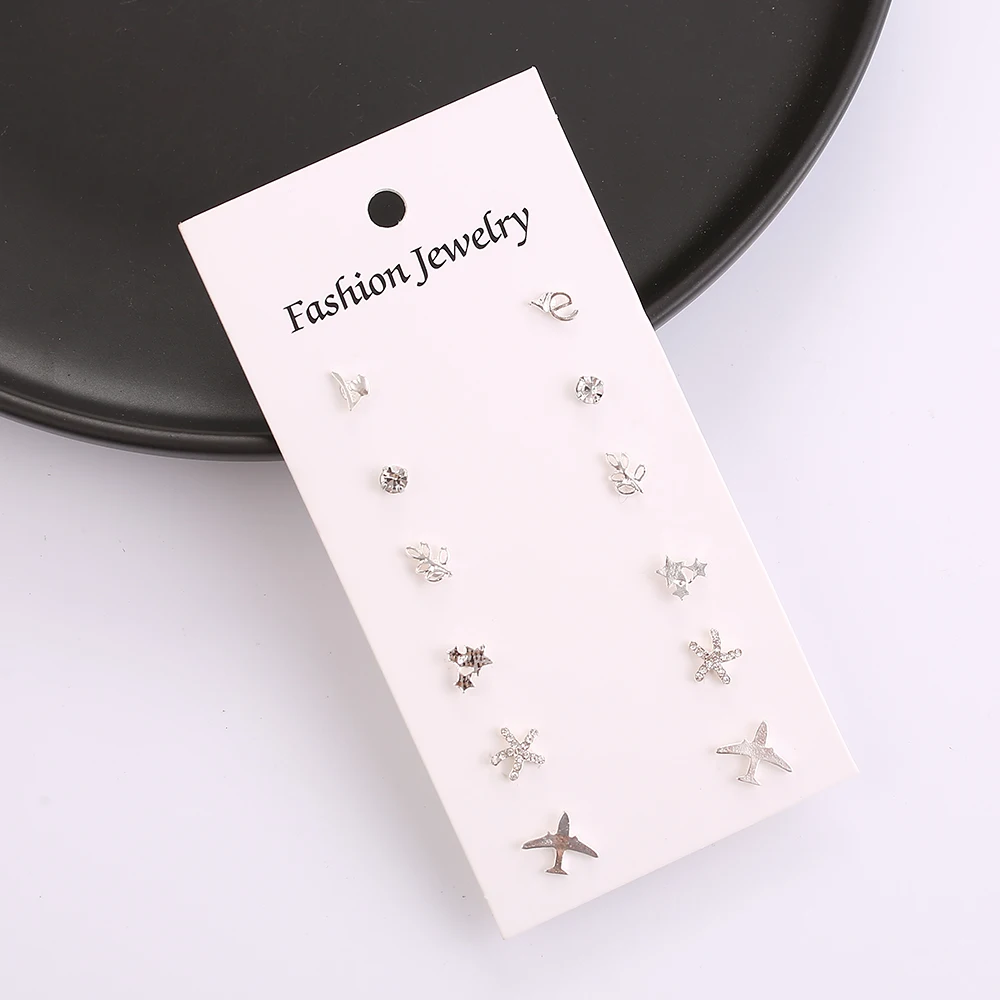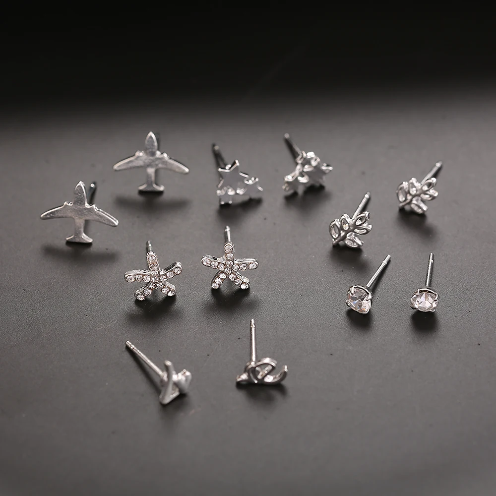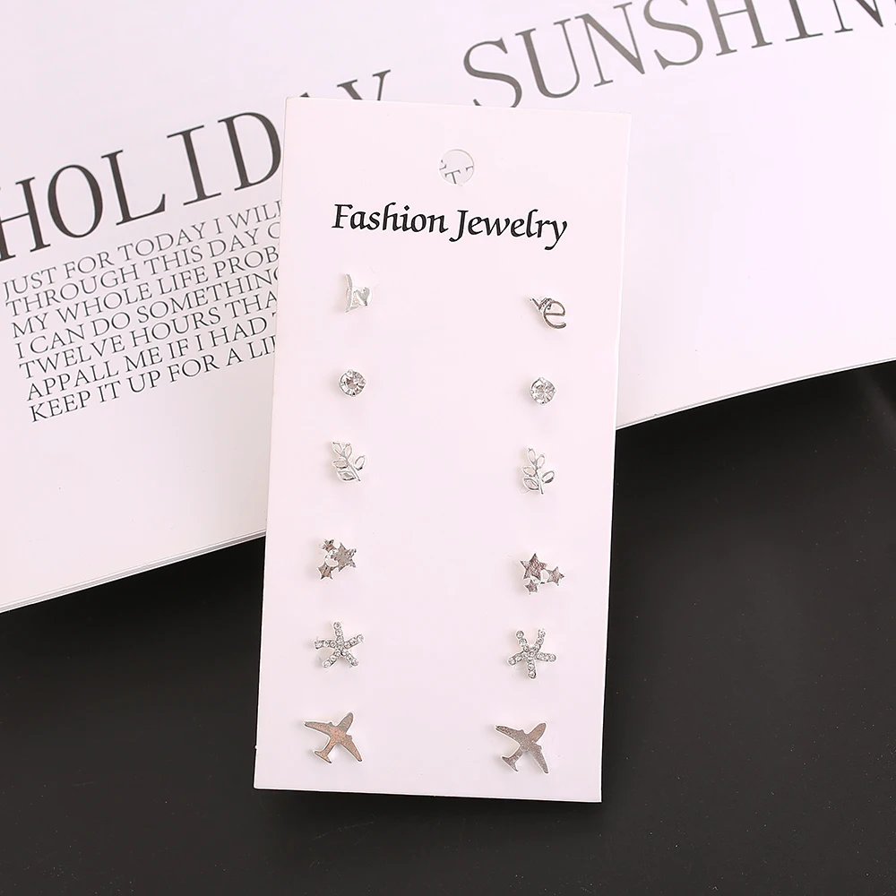 Серьги-гвоздики женские серебристые с кристаллами, 6 пар