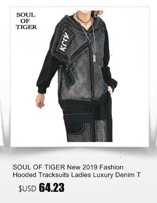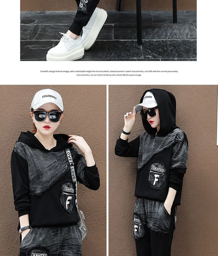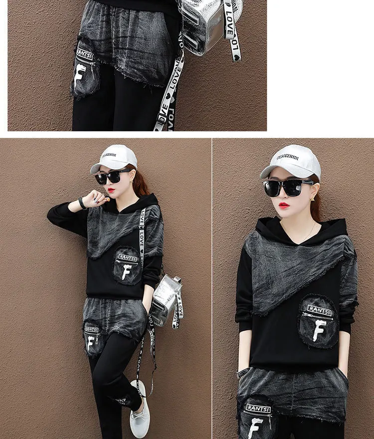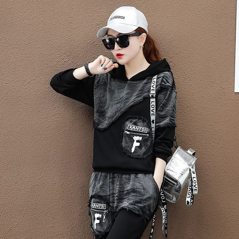Костюм женский джинсовый из топа и штанов с капюшоном, с лоскутным принтом