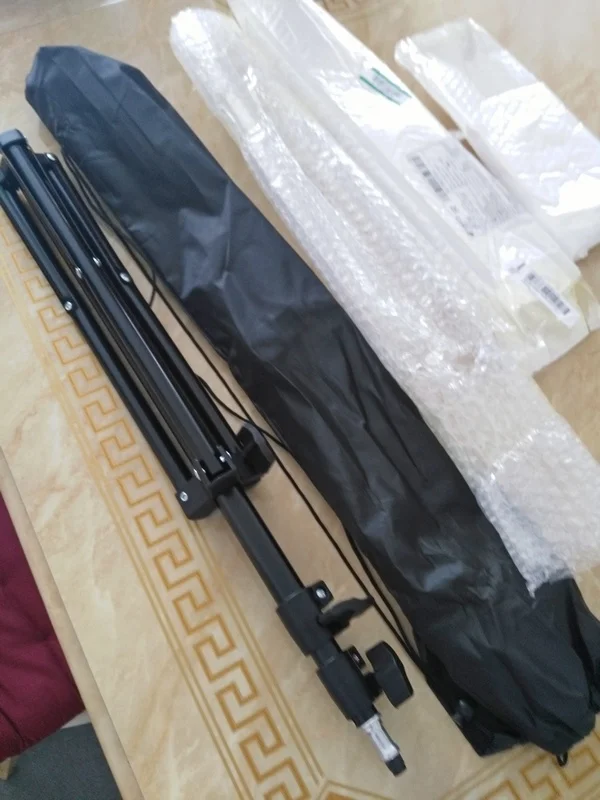Посылка пришла вовремя. упаковка целая. товра не поврежден. Свою цену оправдывает. Жидковата конструкция штатива и материал, но для задуманных целей пойдет для поддержки фона. Отслеживался.