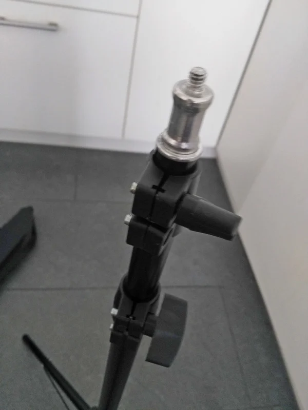 Стойки самые дешёвые. При этом прислали курьерской доставкой. Стойки очень тонкие и лёгкие, из стали как фольга, собраны на алюминиевых заклёпках. На верхушке кроме стандартной для света головы есть дюймовая резьба. Верхняя часть, куда крепить прибор, не выточена, как обычно, а штамповка тоже из тонкого металла. если прибор затянуть, наверное, раздавит.. Фиксаторы работают. Есть ножки или из жёсткой резины, или из пластика, не понял. Для дома пойдет. Для работы - вряд ли