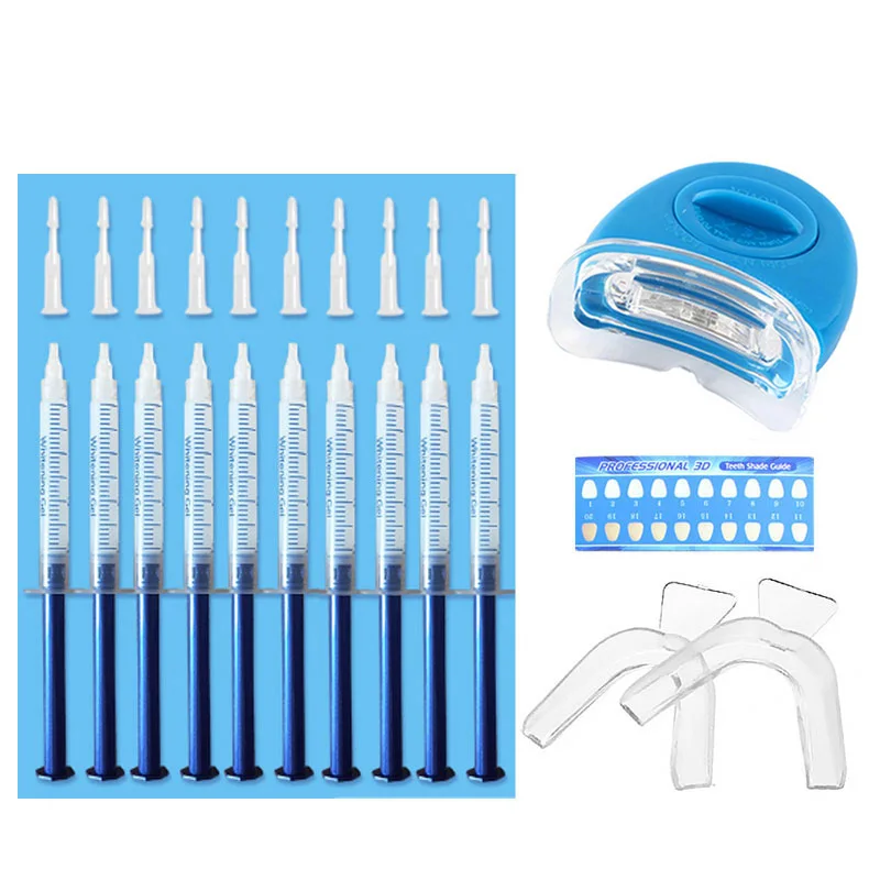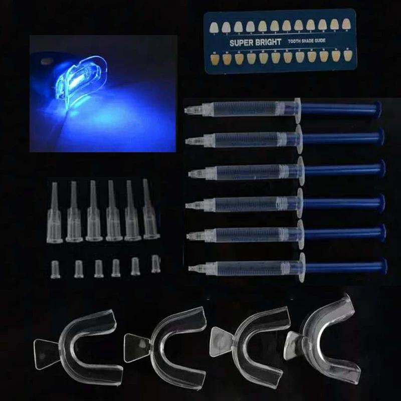 3 * отбеливающий гель (3 мл на) 4 * последний дизайн термоформы одиночные арки лотки 1 * мини холодный светильник, отбеливающая лампа 1 * Профессиональная 3D направляющая для затенения зубов