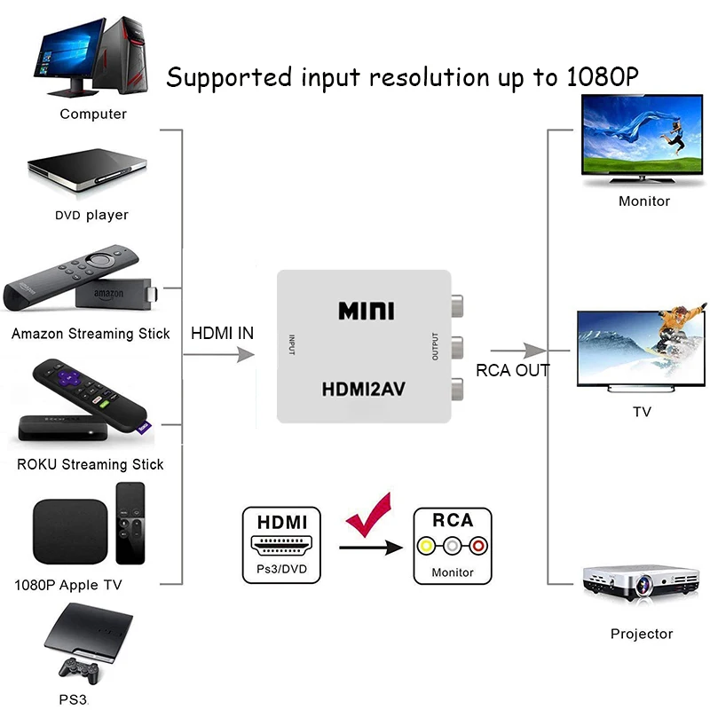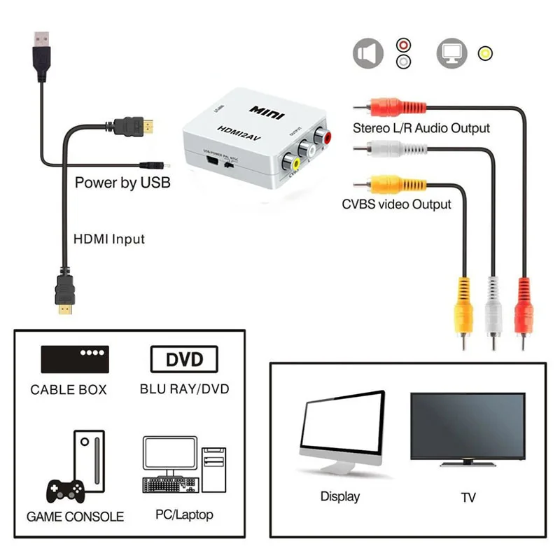 Есть 3 вида конвертера hdmi в av, пожалуйста, обратитесь к картинке, которую вы выбрали, когда вы размещаете заказ.