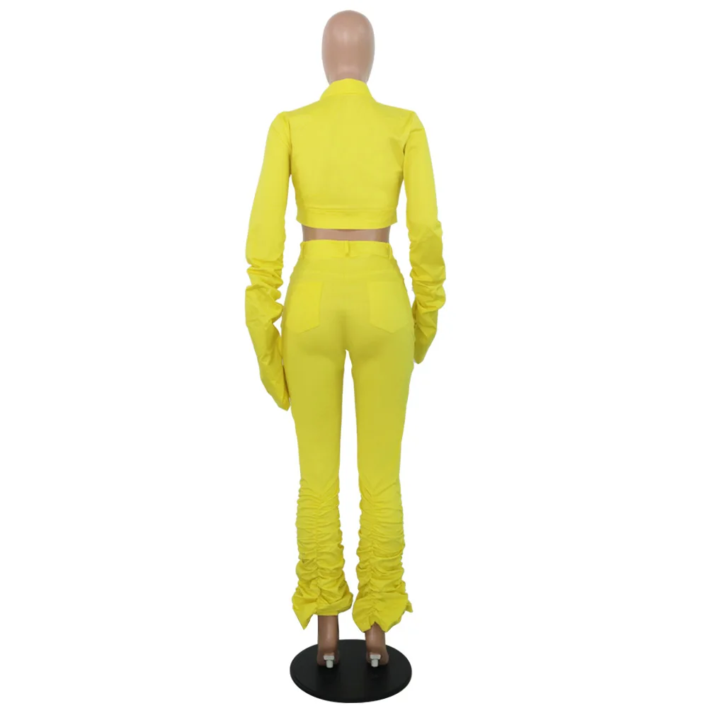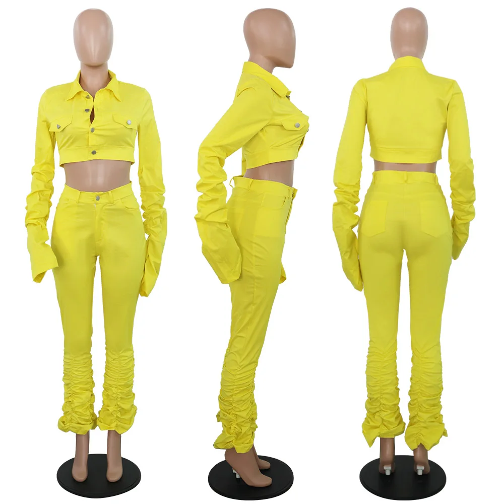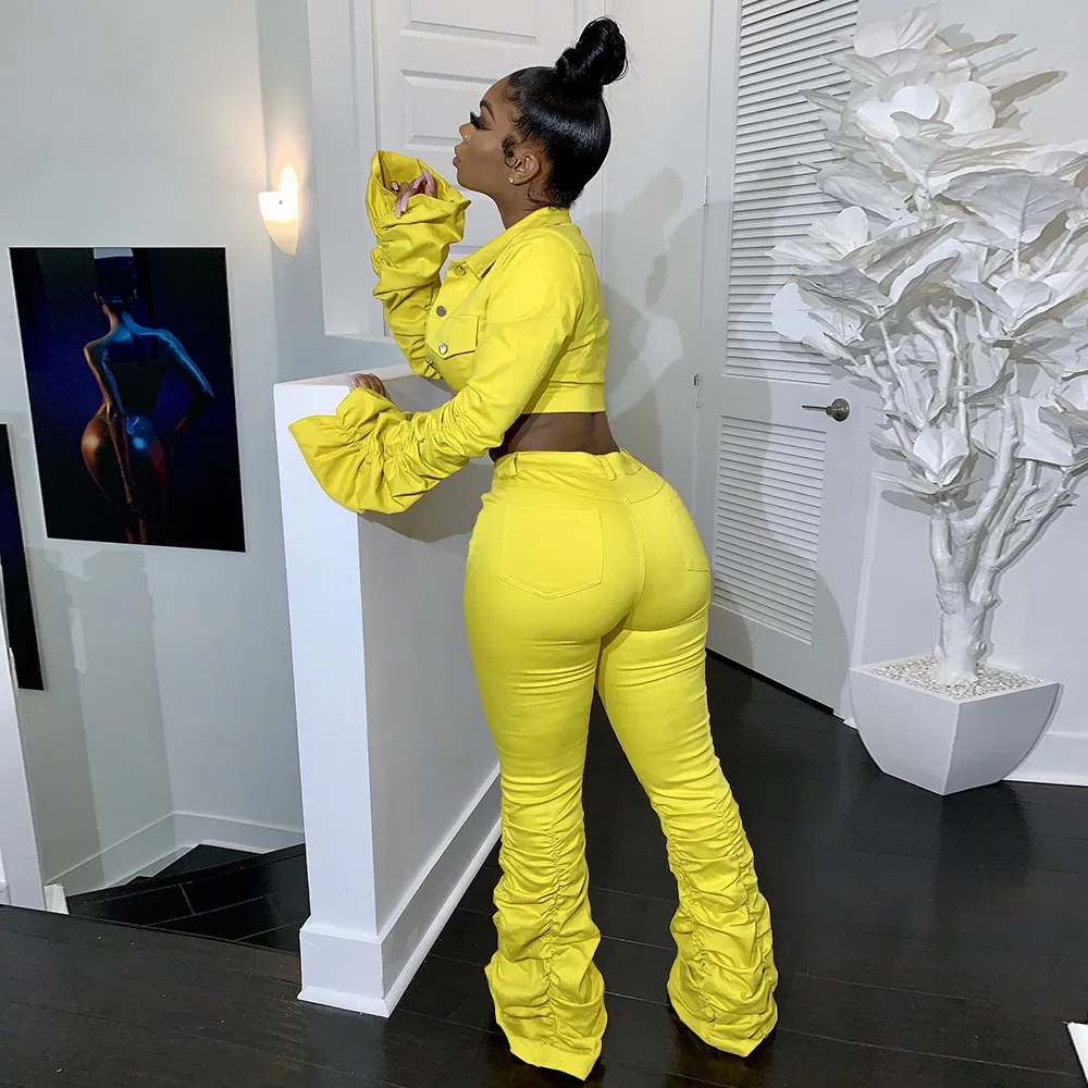 Желтые джинсовые SexyTwo предмета Комплект женский короткий на пуговицах джинсовая куртка с длинными рукавами + длинные брюки-клеш модные тонкие в комплекте с набором подходящих сумочек Femme спортивный костюм