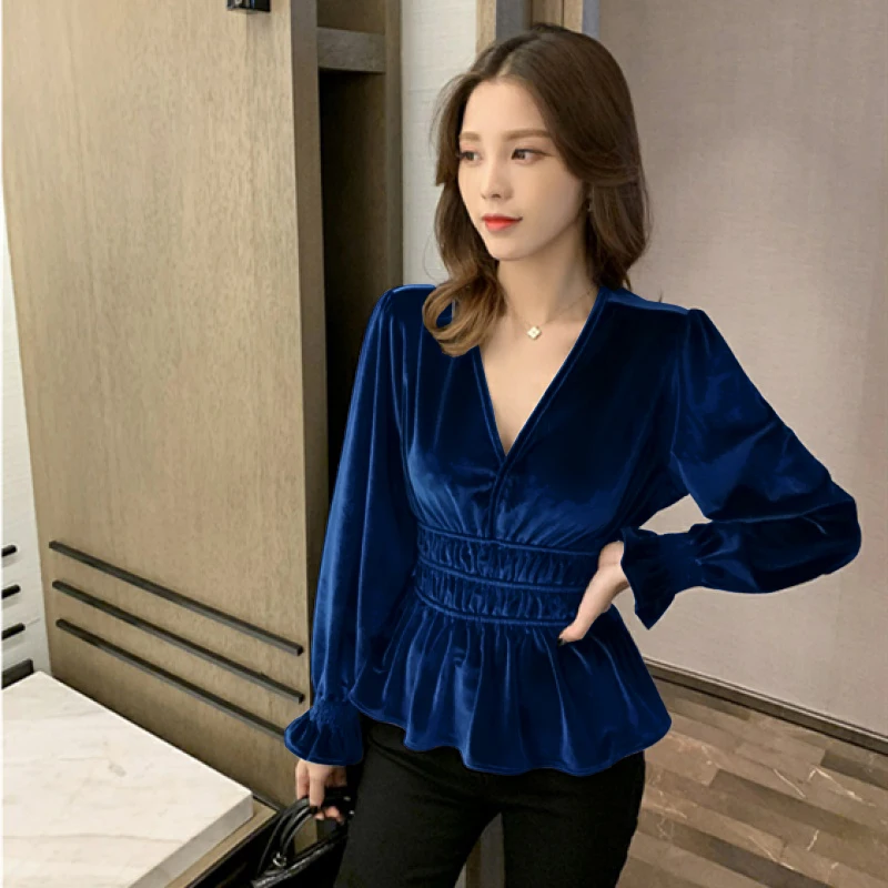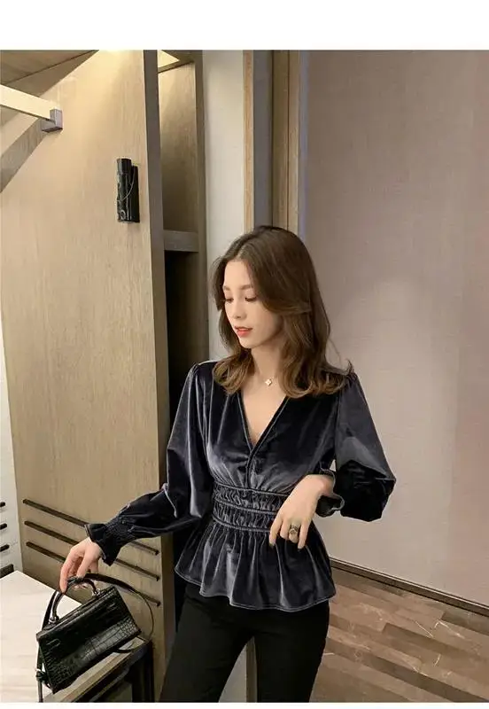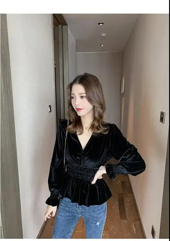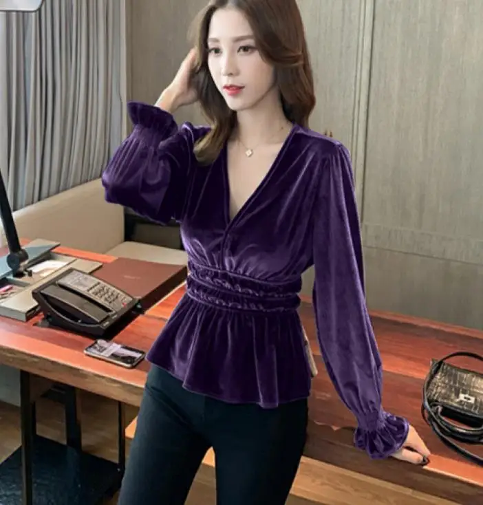 Женские велюровые блузки с длинным рукавом, Осенние велюровые Женские топы с баской, женские бархатные рубашки, велюровые топы с оборками